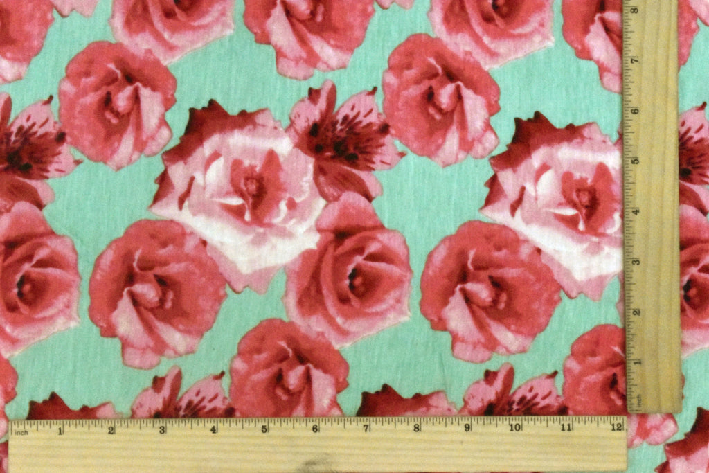 Mint Green-Pink-Multi Rose Printed Slub Rayon Stretch Jersey Knit Fabric
