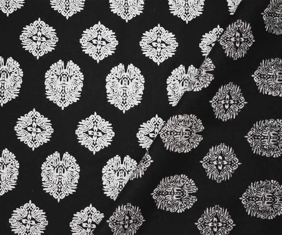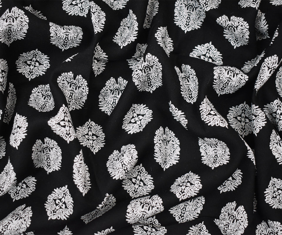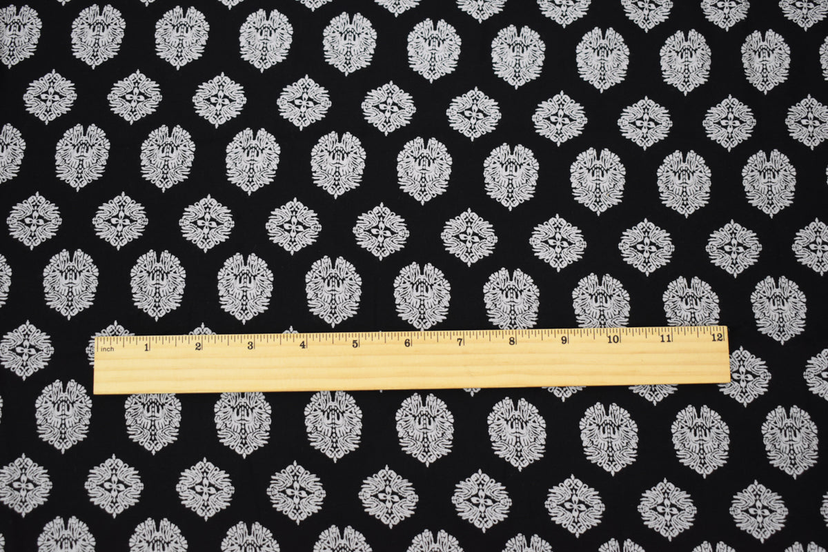 Black Rayon Famous Designer Crest Print Challis Woven Fabric