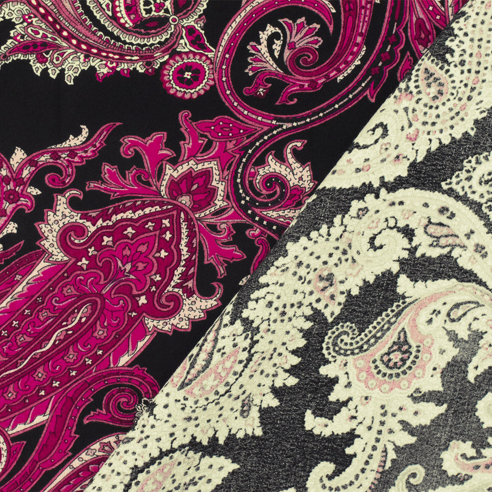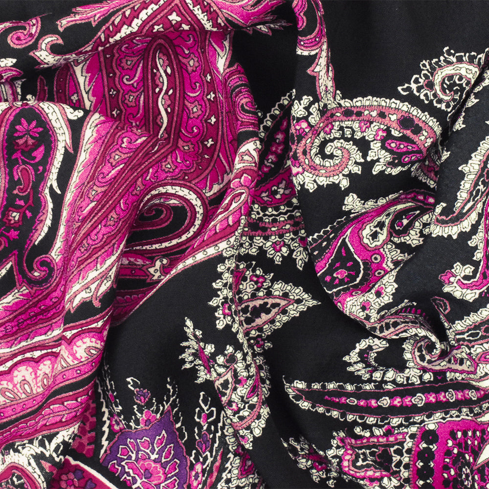 Fuchsia-Pink-Multi Famous Designer Viscose Paisley Printed Crepe Faille Fabric