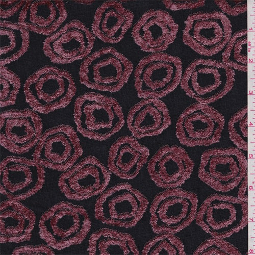 Lightweight polyester jersey knit with a rose pink flocked circular design. Soft, brushed surface with a nice drape. Moderate stretch in width and bias. Suitable for knit fashion tops and dancewear. Semi-sheer when stretched, a lining or underlay should be used when opacity is desired. Machine washable.