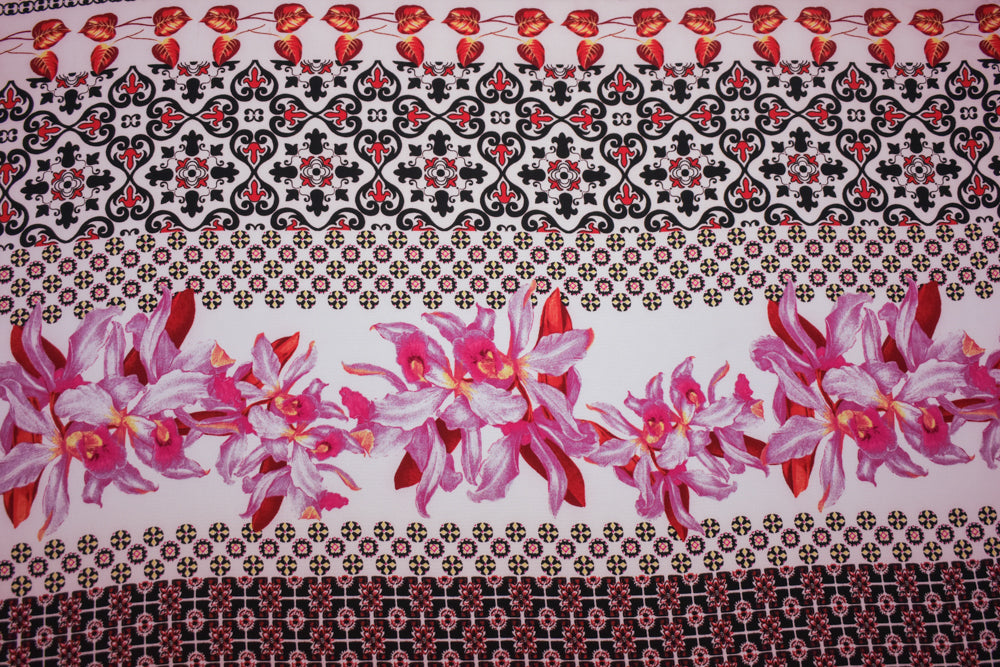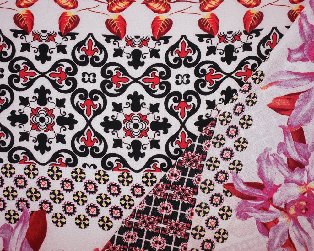 3 YD PC -White-Red-Multi Poly Floral Border Printed Pebble Crepe Woven Fabric