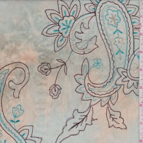 2 1/2 YD PC-Beige/Spa Blue Embroidered Paisley Crinkled Chiffon Fabric