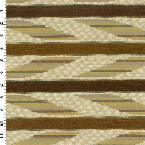 This woven stripe fabric is fashioned in an earthy pallet which features shades of brown and beige, some with green, purple, and gold undertones. It is an ikat style zig-zag separated by bands of soft brown chenille. It is mid-weight home decorating fabric best suited for items like pillows or sofas but can also be used as heavy drapery. Railroaded.