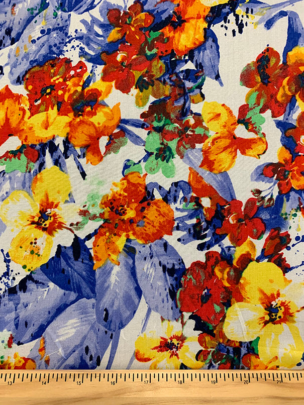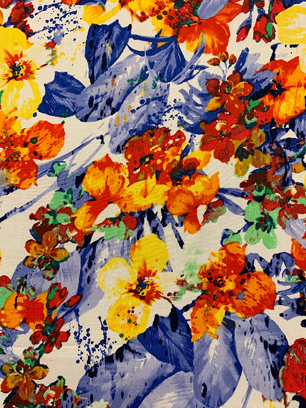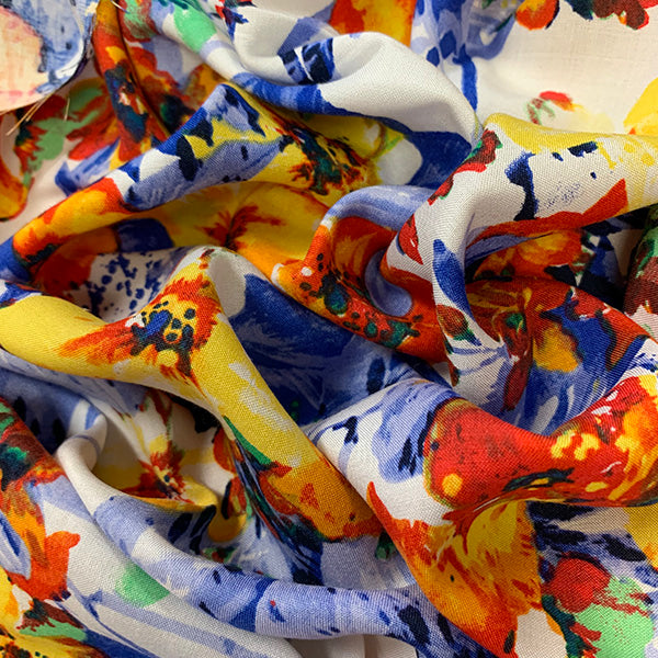 2 3/4 YD PC -Red, Blue, Orange, Yellow, & Green Floral Print on White Rayon Challis Fabric