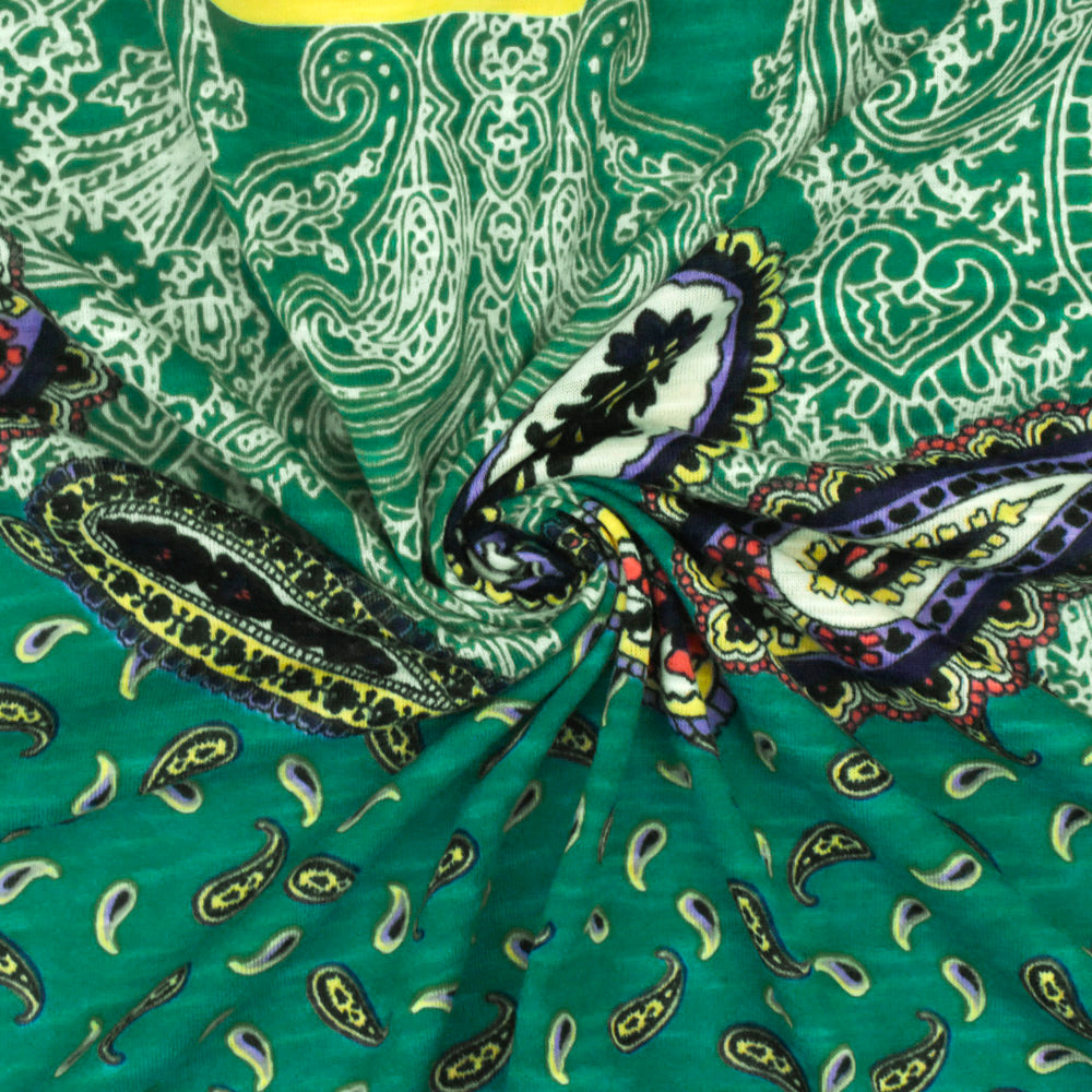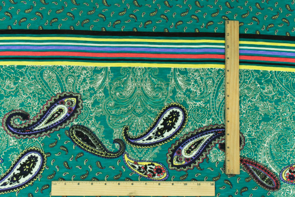 2 YD PC-Turquoise-Multi Paisley With Stripe Printed Stretch Poly Slub Jersey Knit Fabric
