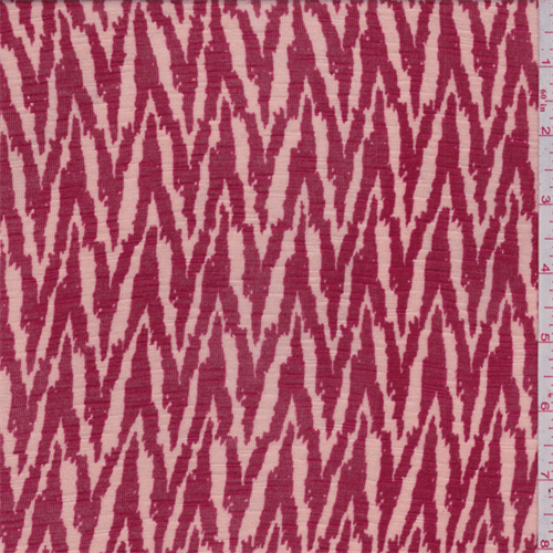 Beige and cherry red flamestitch print with a slight sheen. A very soft and lightweight rayon knit fabric with slubs. Moderate widthwise stretch and good drape.