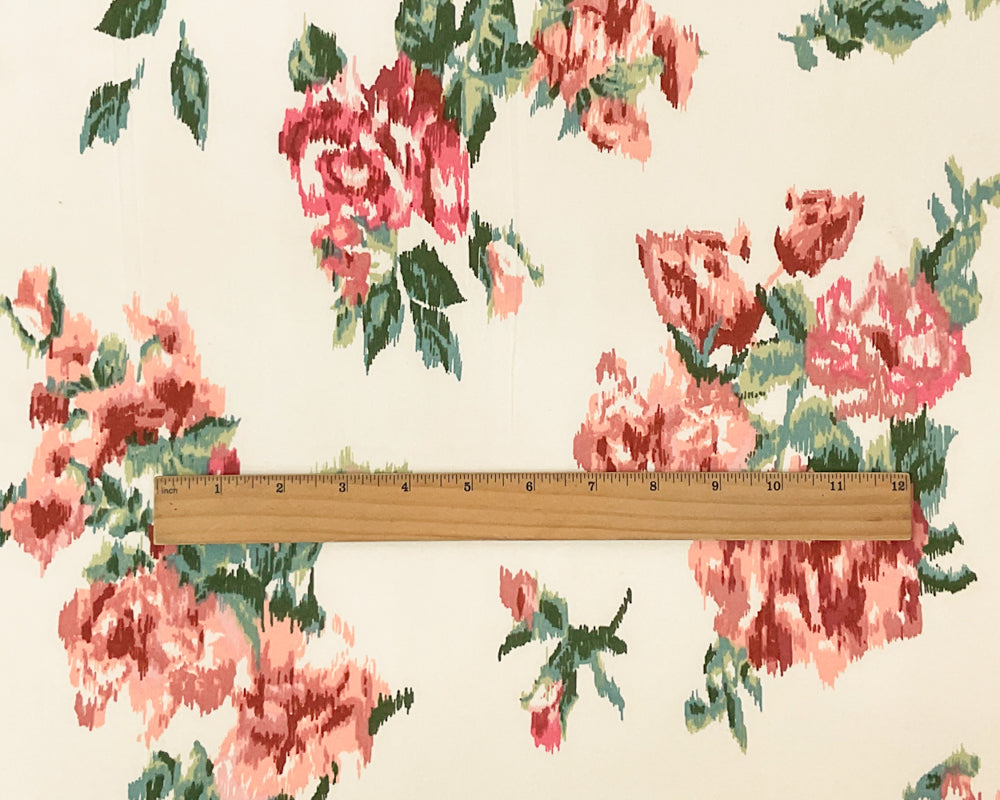 Coral-Multi Poly Stretch Floral Ikat Print DB Jersey Knit Fabric