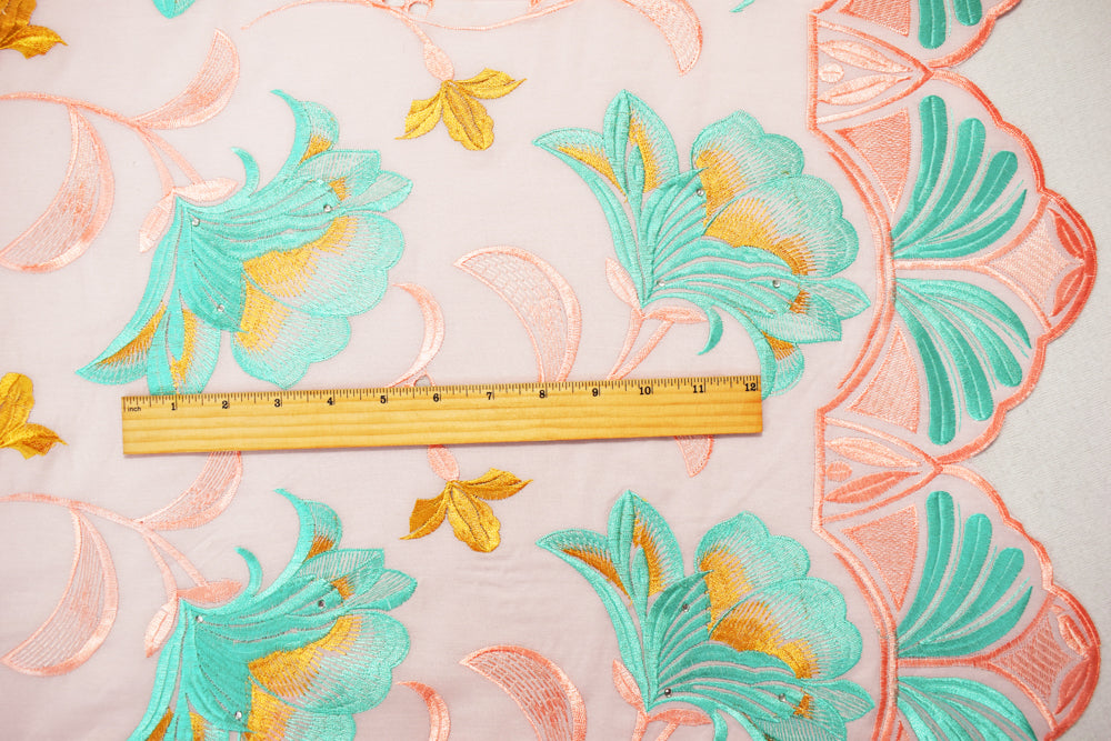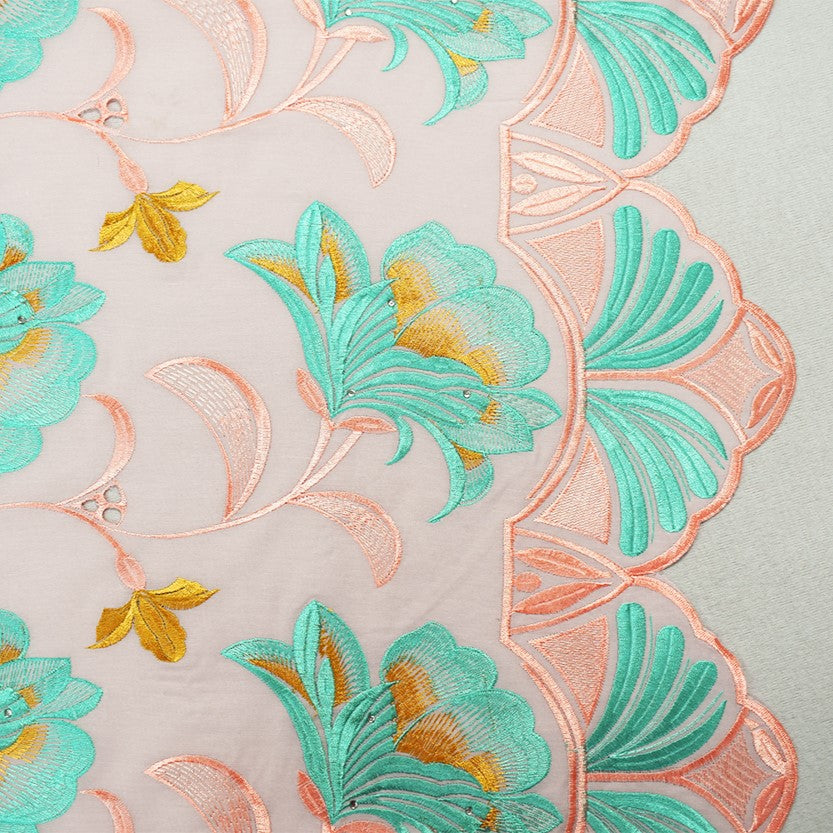 Coral Orange-Teal-Multi Poly-Cotton Floral Vine Embroidery Scallop Woven Fabric