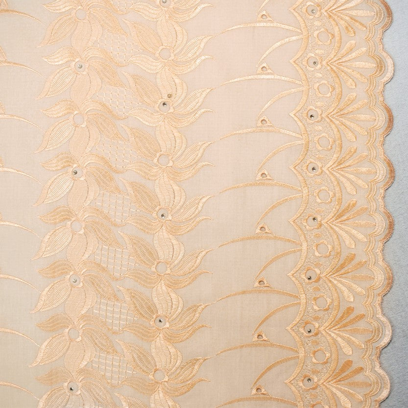 Light Beige Poly-Cotton Embroidered Floral Scallop Rhinestone Woven Fabric
