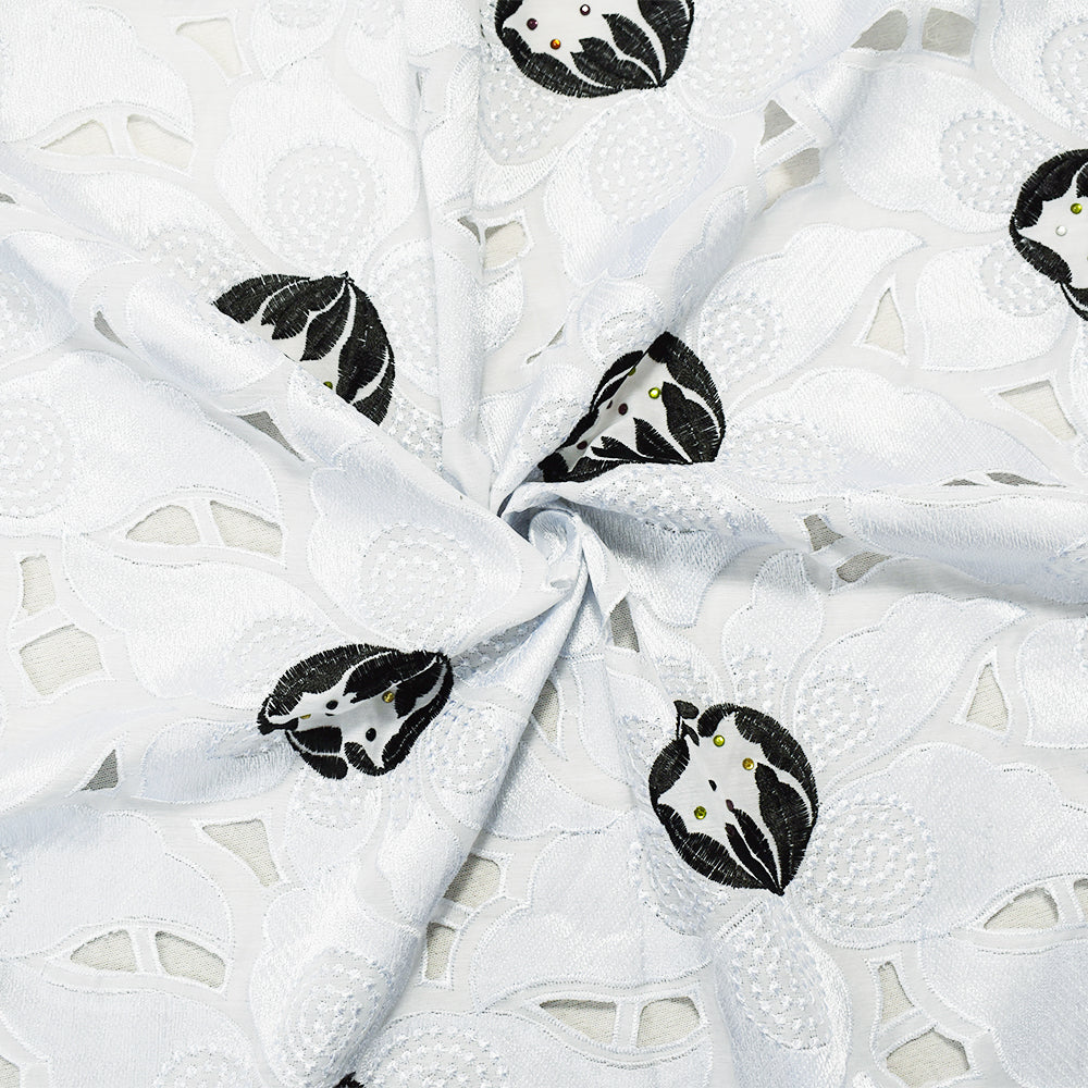 White-Multi Poly Embroidered Floral Scallop Rhinestone Woven Fabric