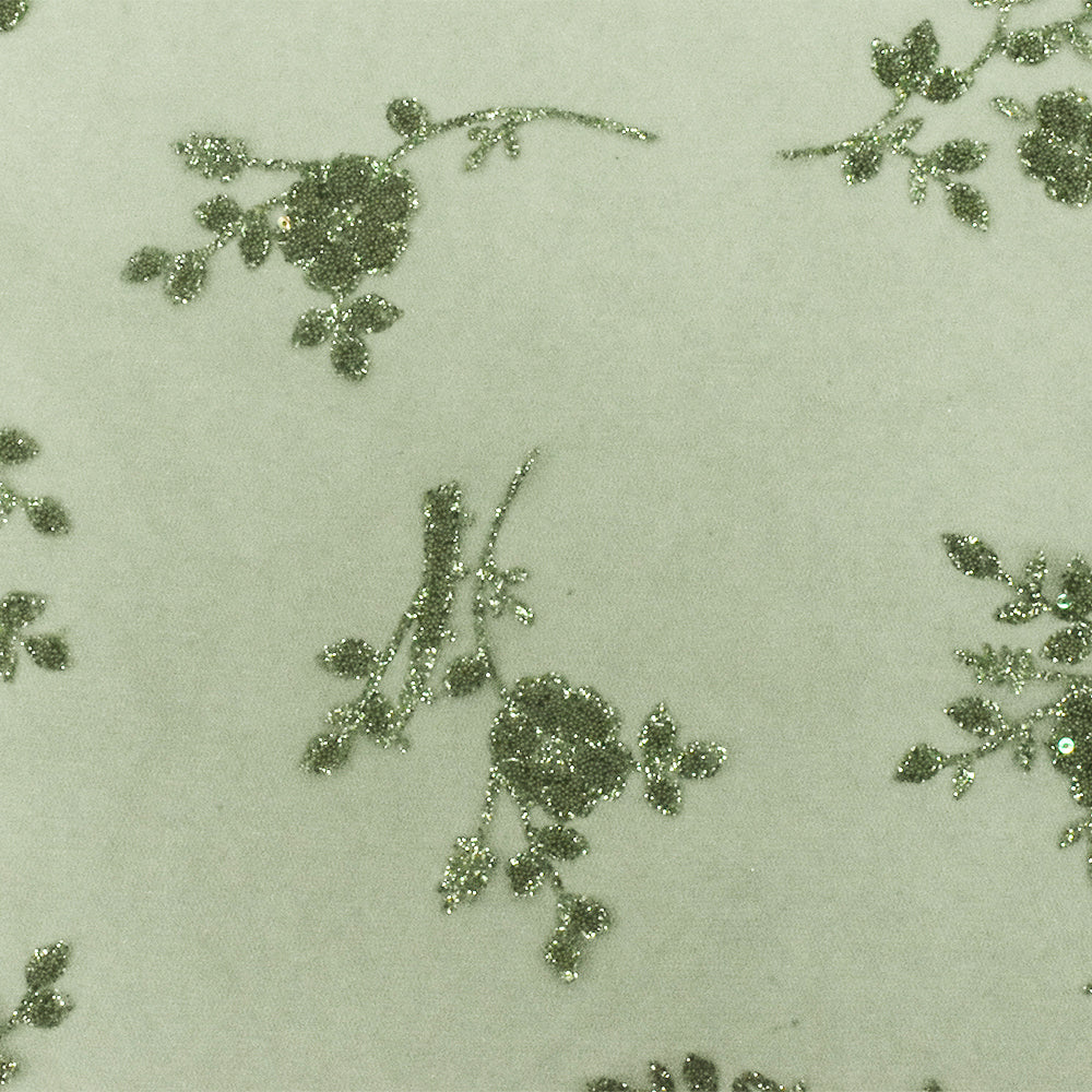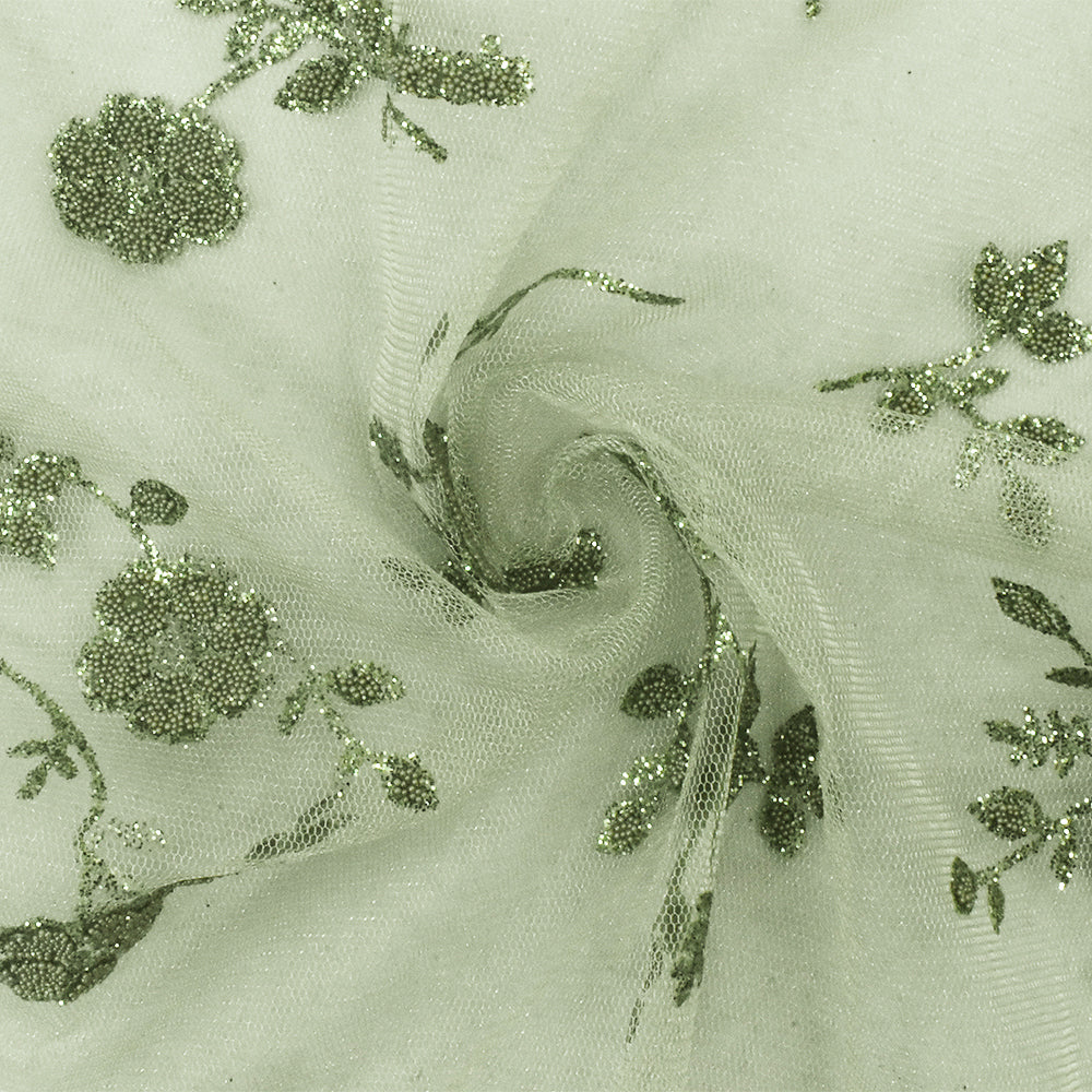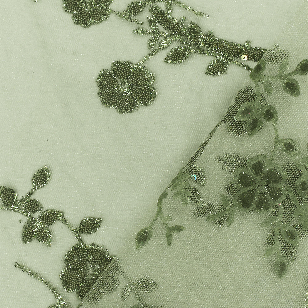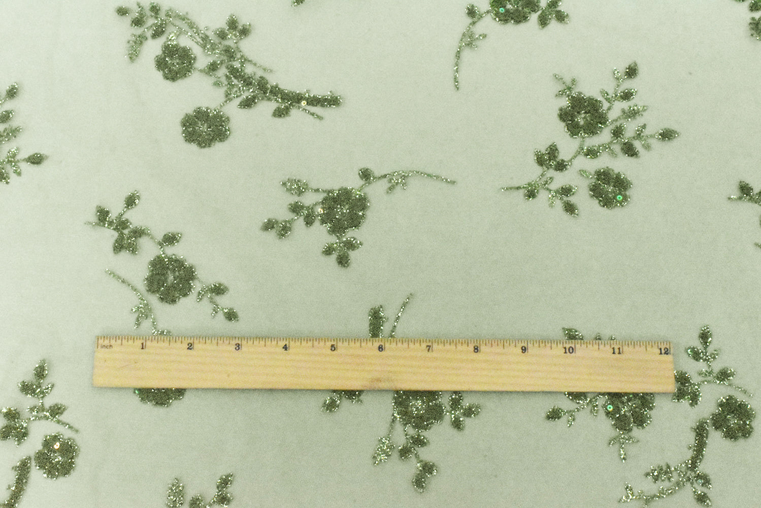 2 1/2 YD PC-Olive Green Floral Sparkles and Bead Poly Mesh Knit Fabric