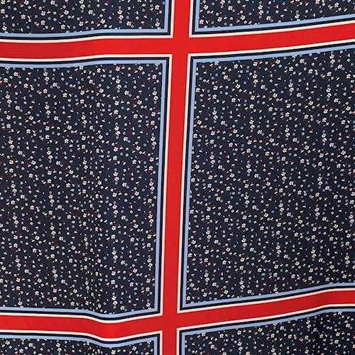-Printed polyester charmeuse PANELS. Each PANEL is 58" Wide and 28" Long, and have side by side squares with floral print with red borders.
