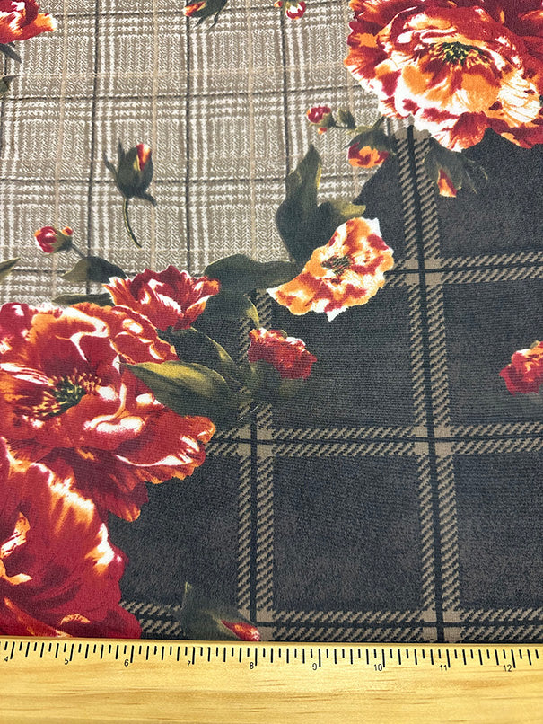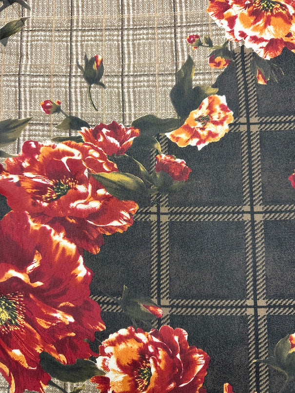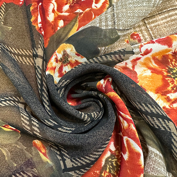 2 YD PC-Brown Plaid Floral Print Poly Chiffon Fabric