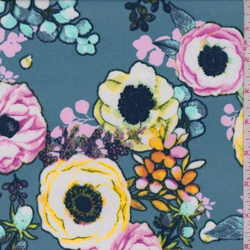 Dusty Blue Multi Floral Bloom Brushed Jersey Knit Fabric