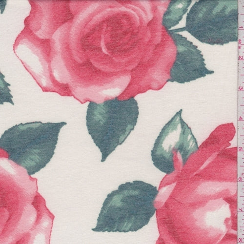 Ivory/Coral Red Rose Baby French Terry Knit Fabric
