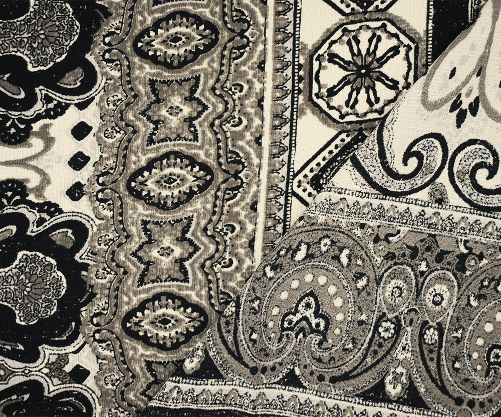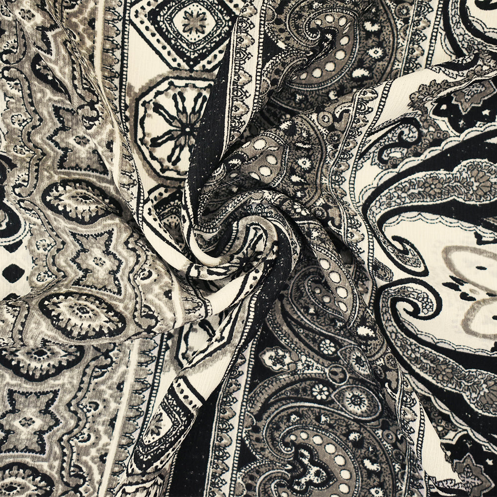 Black-Gray-Multi Poly Paisley Baroque Printed Crepe Georgette Woven Fabric