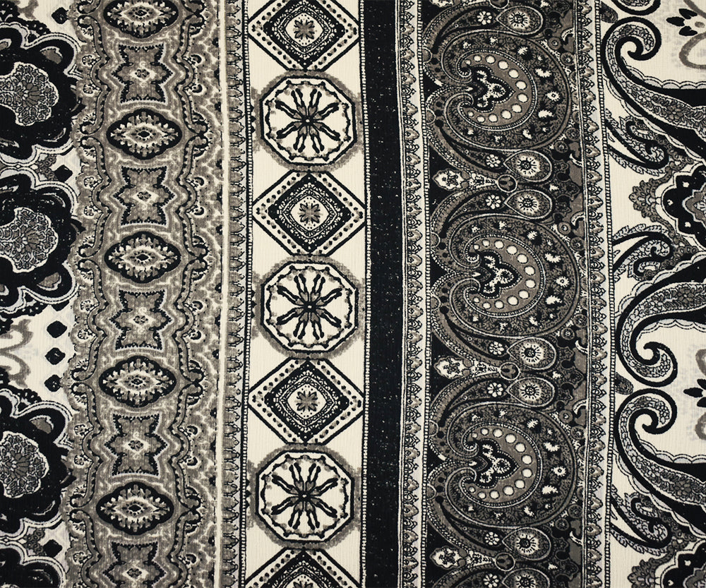-100% polyester crepe georgette with straited like textures printed with baroque and paisley patterns in a stripe arrangement