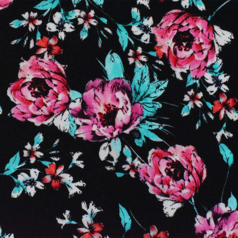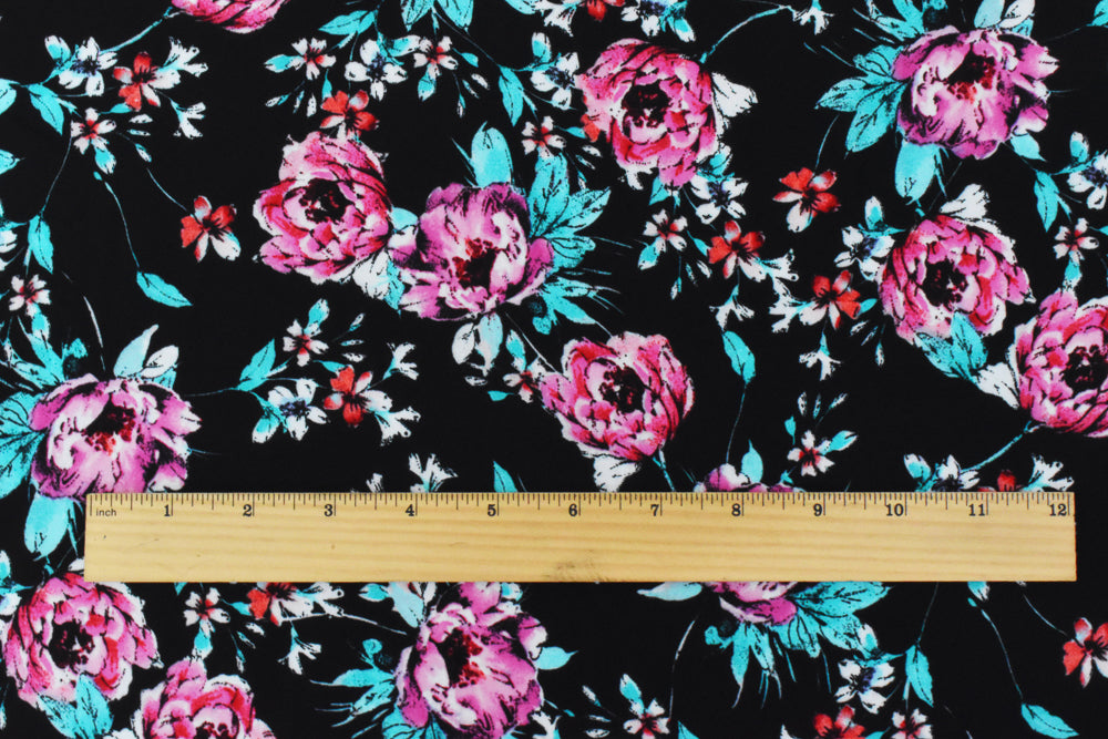Black-Teal-Pink Polyester Floral Printed Momie Crepe Georgette Woven Fabric