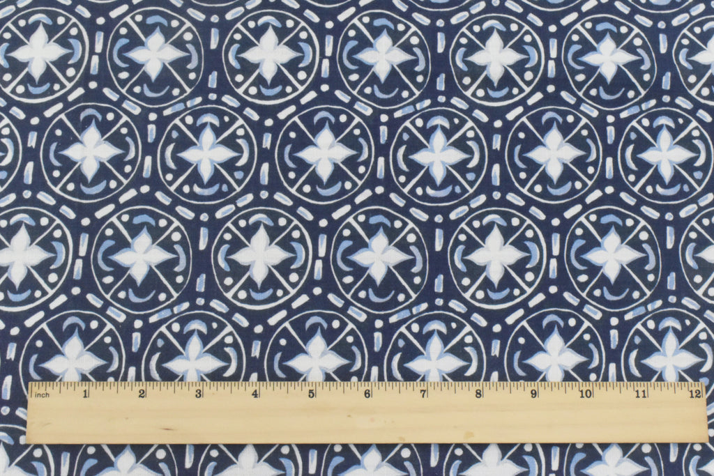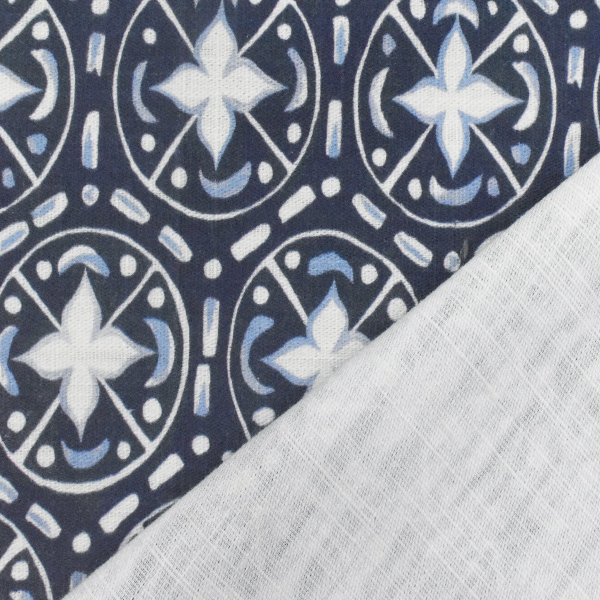 -100% cotton slubbed woven fabric printed with a tile-like morrocan inspired pattern