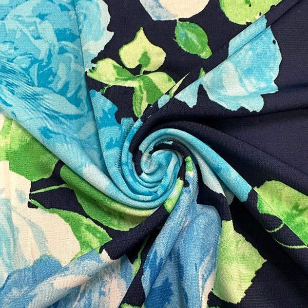 -White, Turquoise, Green, & Blue Floral Print on Navy Blue ITY Jersey Knit Fabric