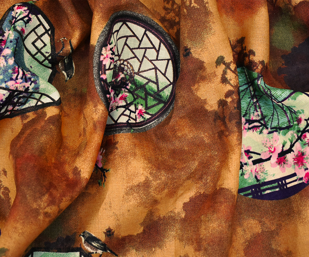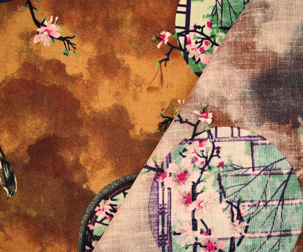 -100% linen plain woven fabric printed with a beautiful artistic stylized pattern featuring window deisgns with cherry blossoms. Line if needed.