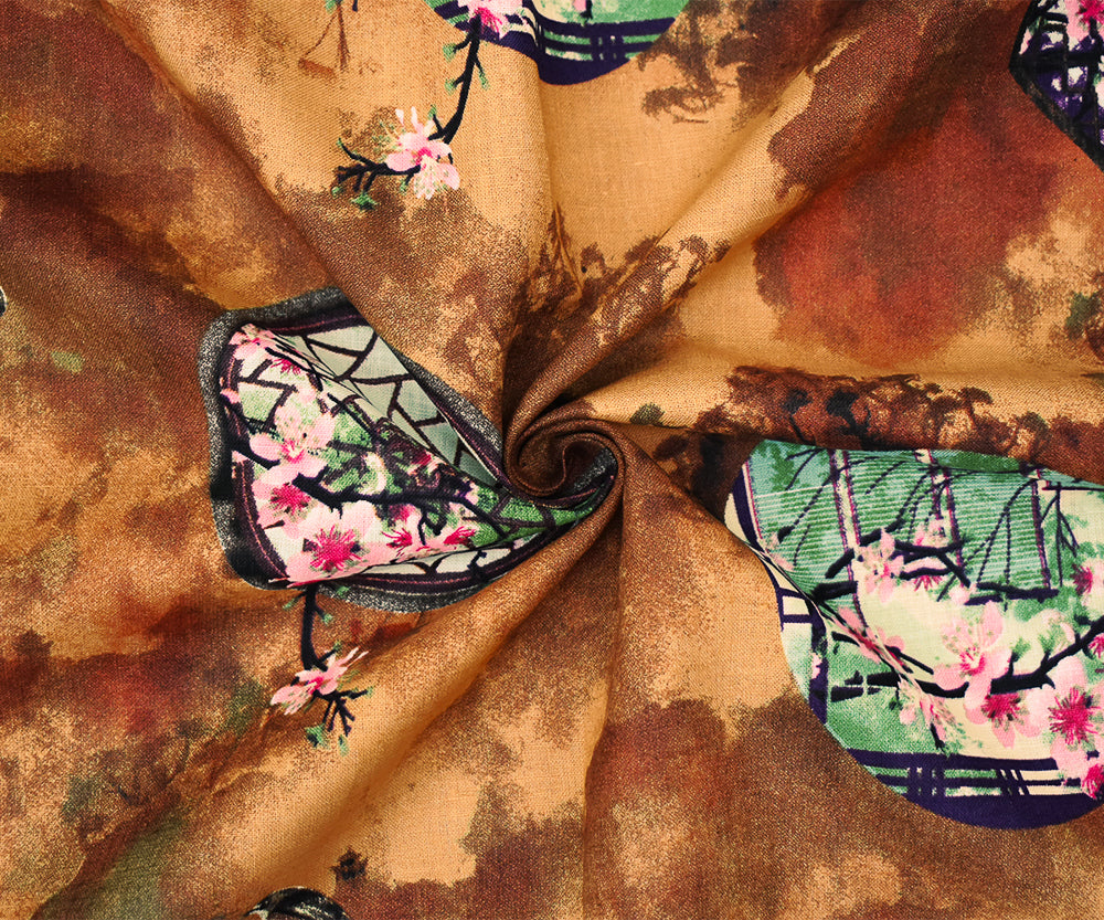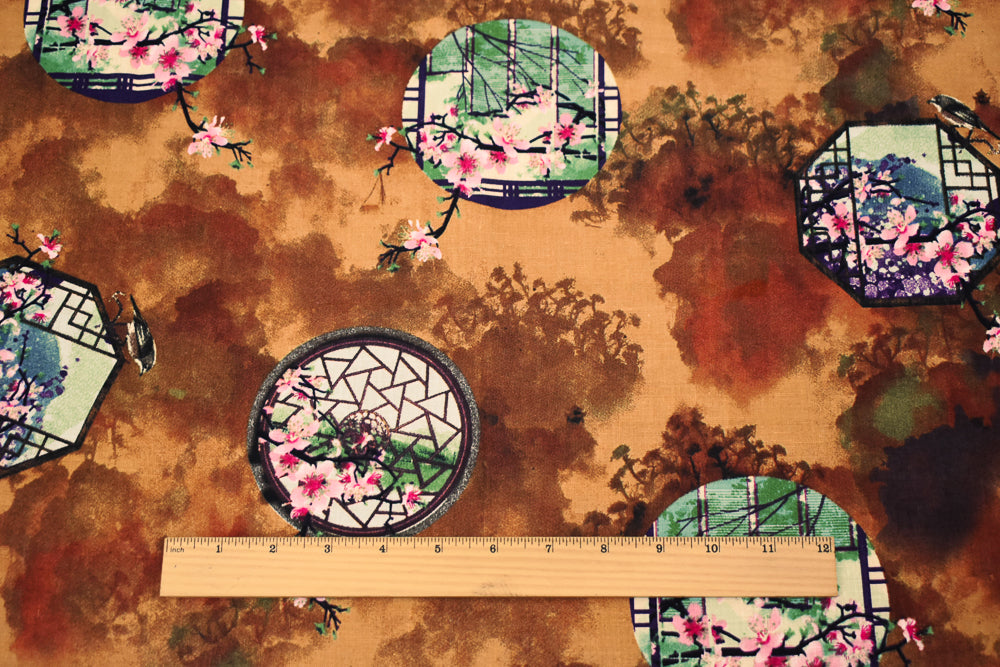 Brown-Mint Green-Multi Cherry Blossom Window Printed Linen Woven Fabric