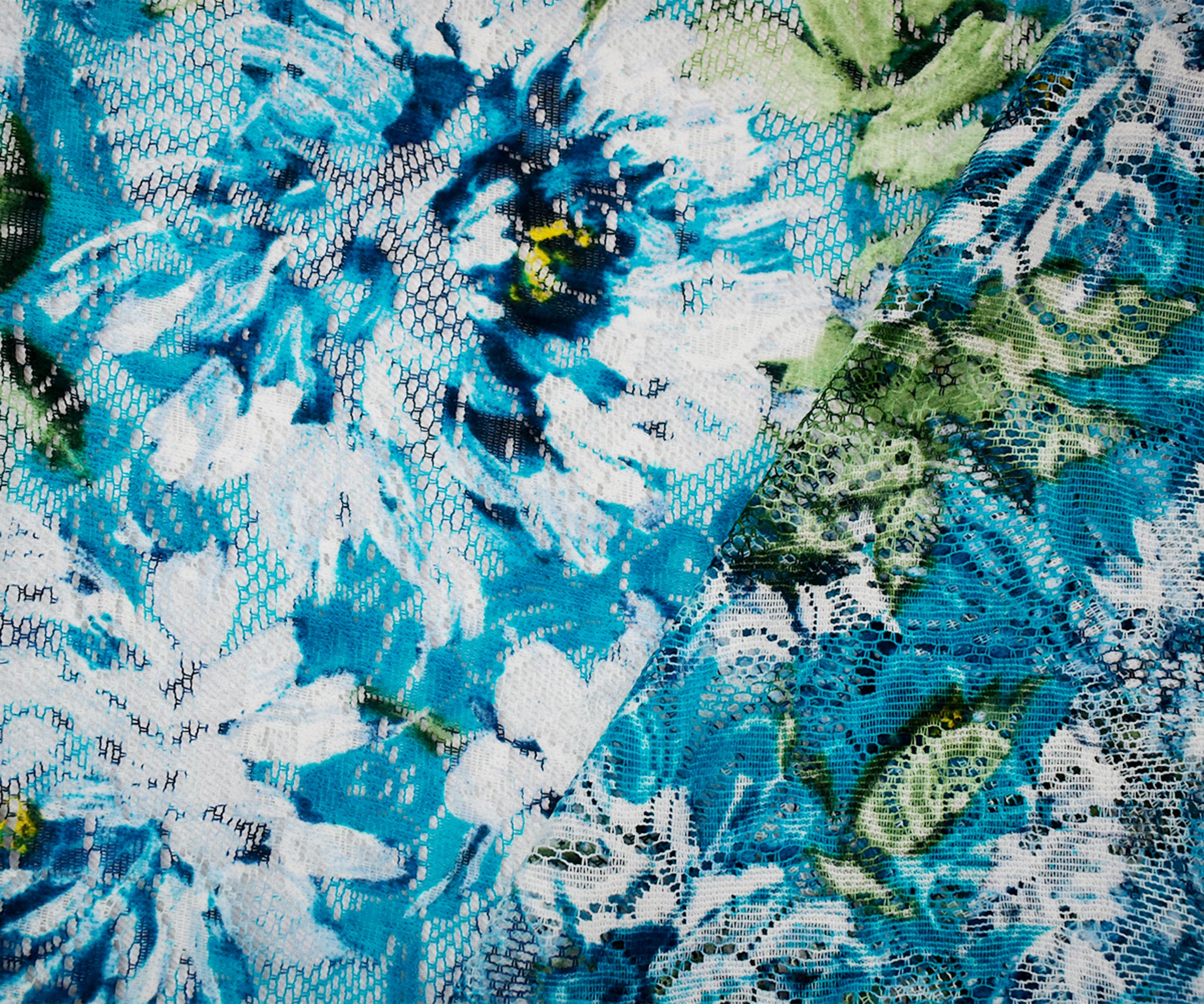 Deep Teal-Multi Poly Rayon Floral Printed Crochet Lace Knit Fabric