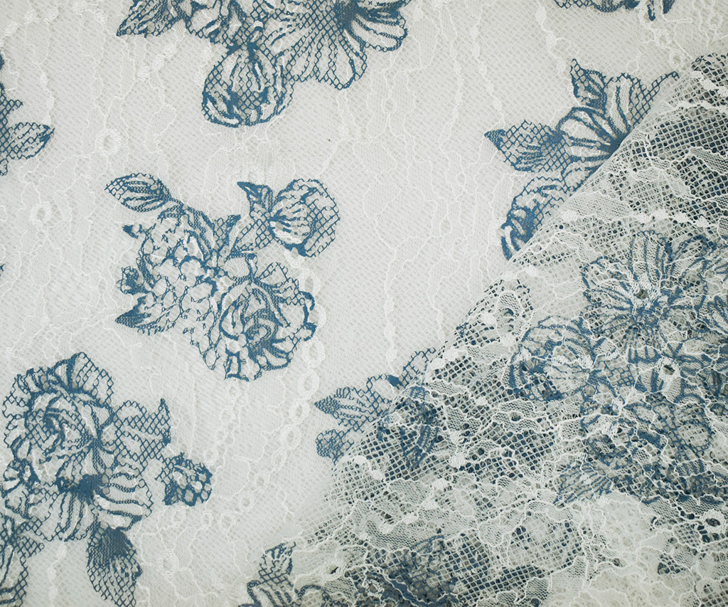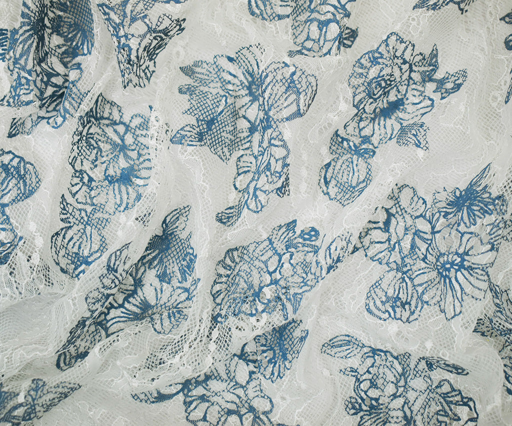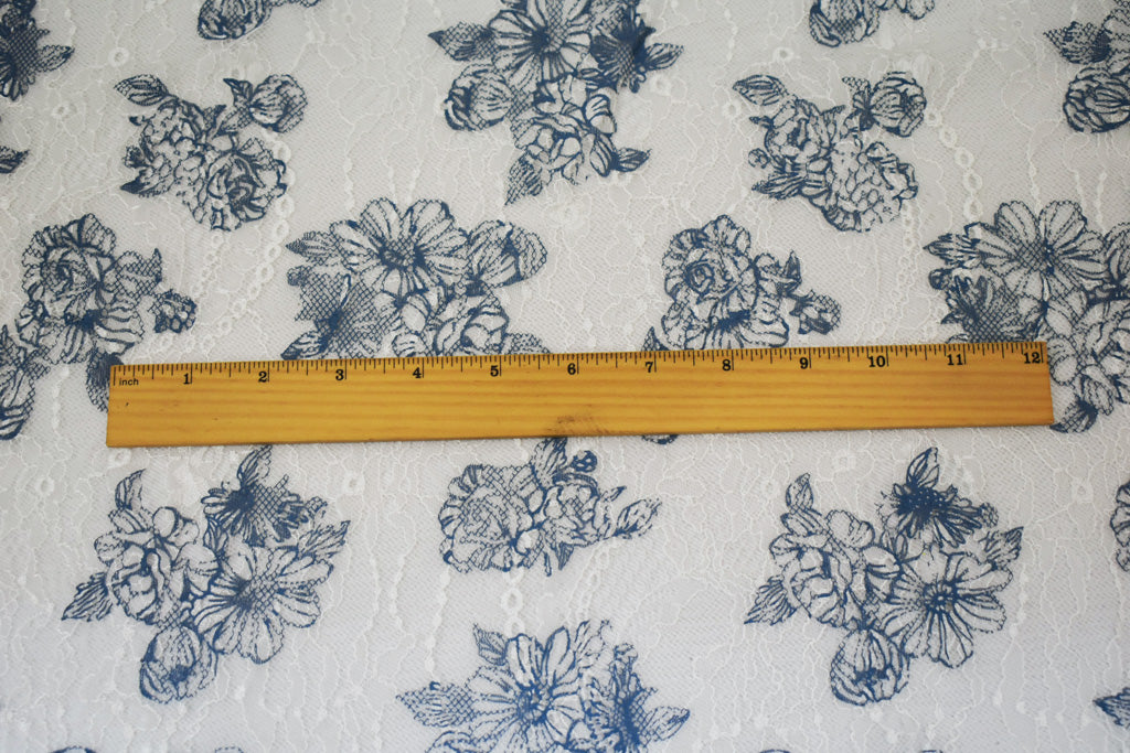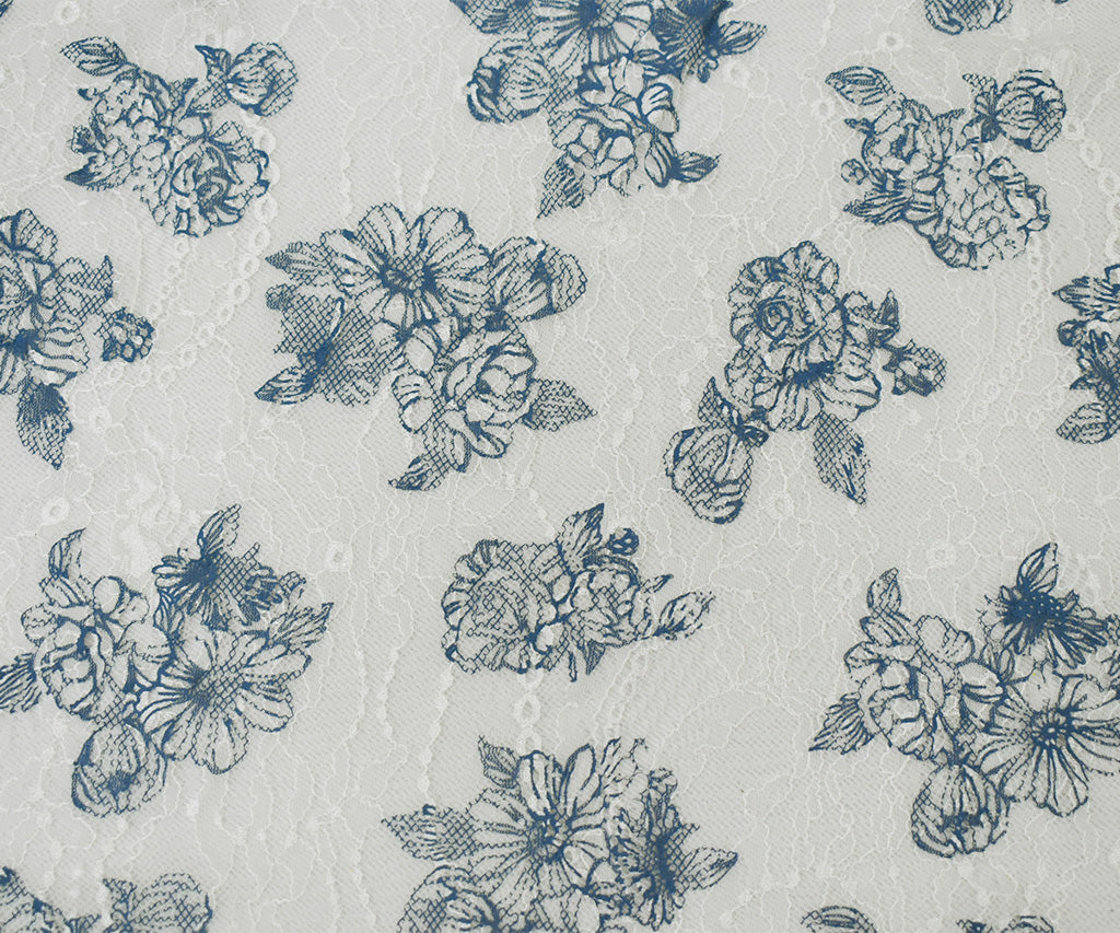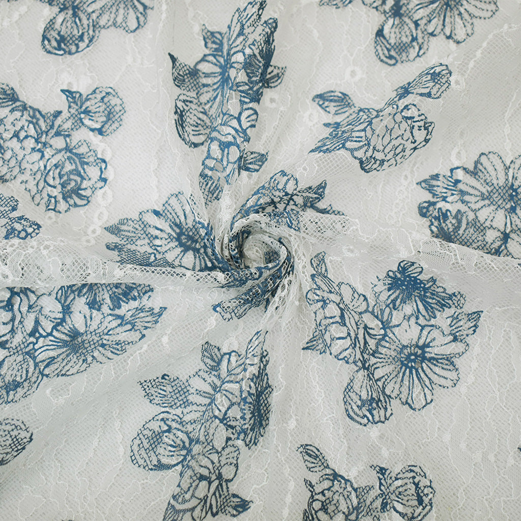 White-Blue Nylon Floral Printed Lace Knit Fabric