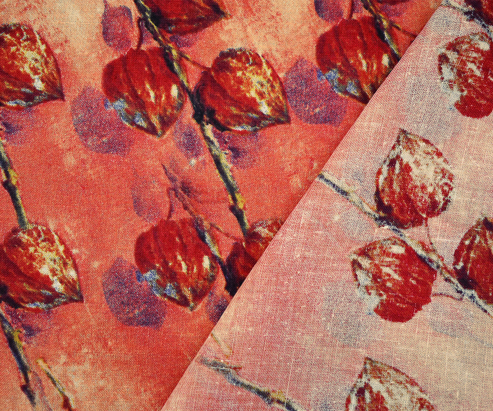 Orange-Red-Multi Leaf and Branches Pattern Printed Linen Woven Fabric