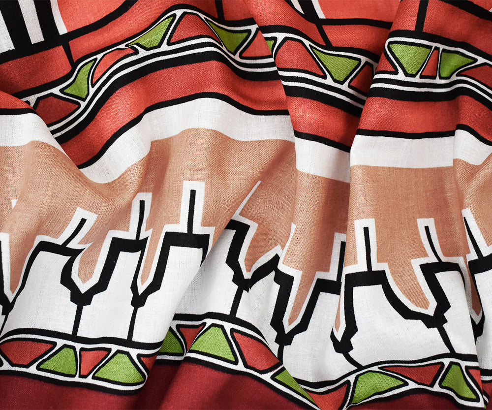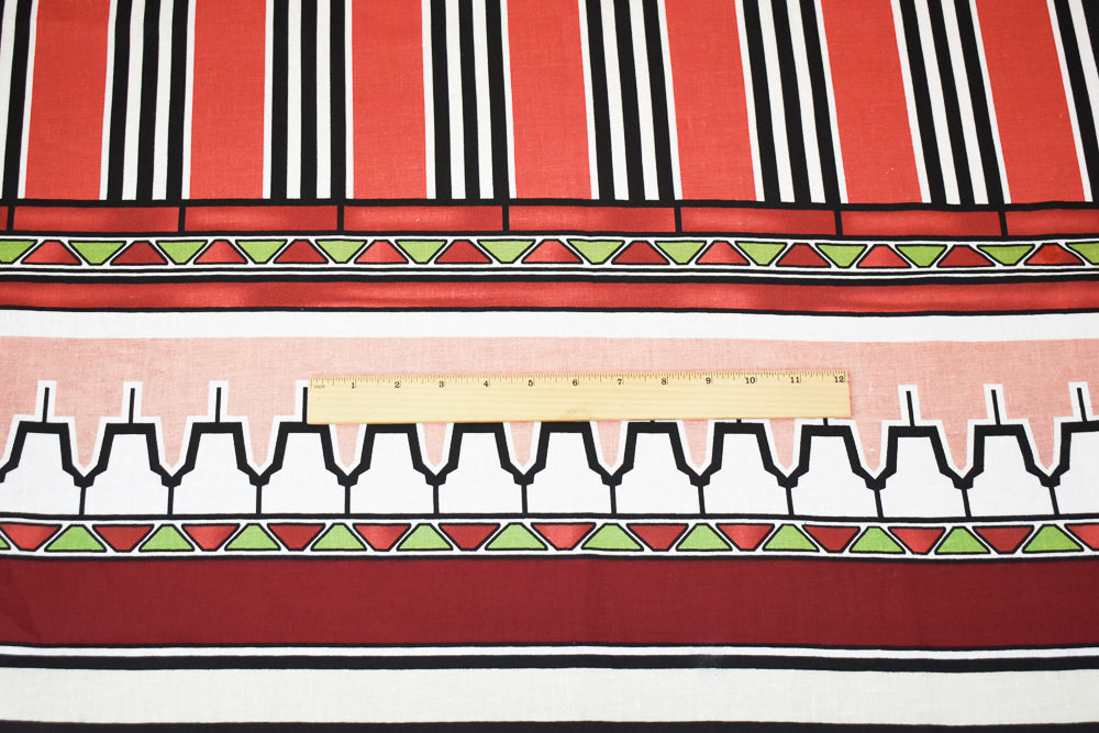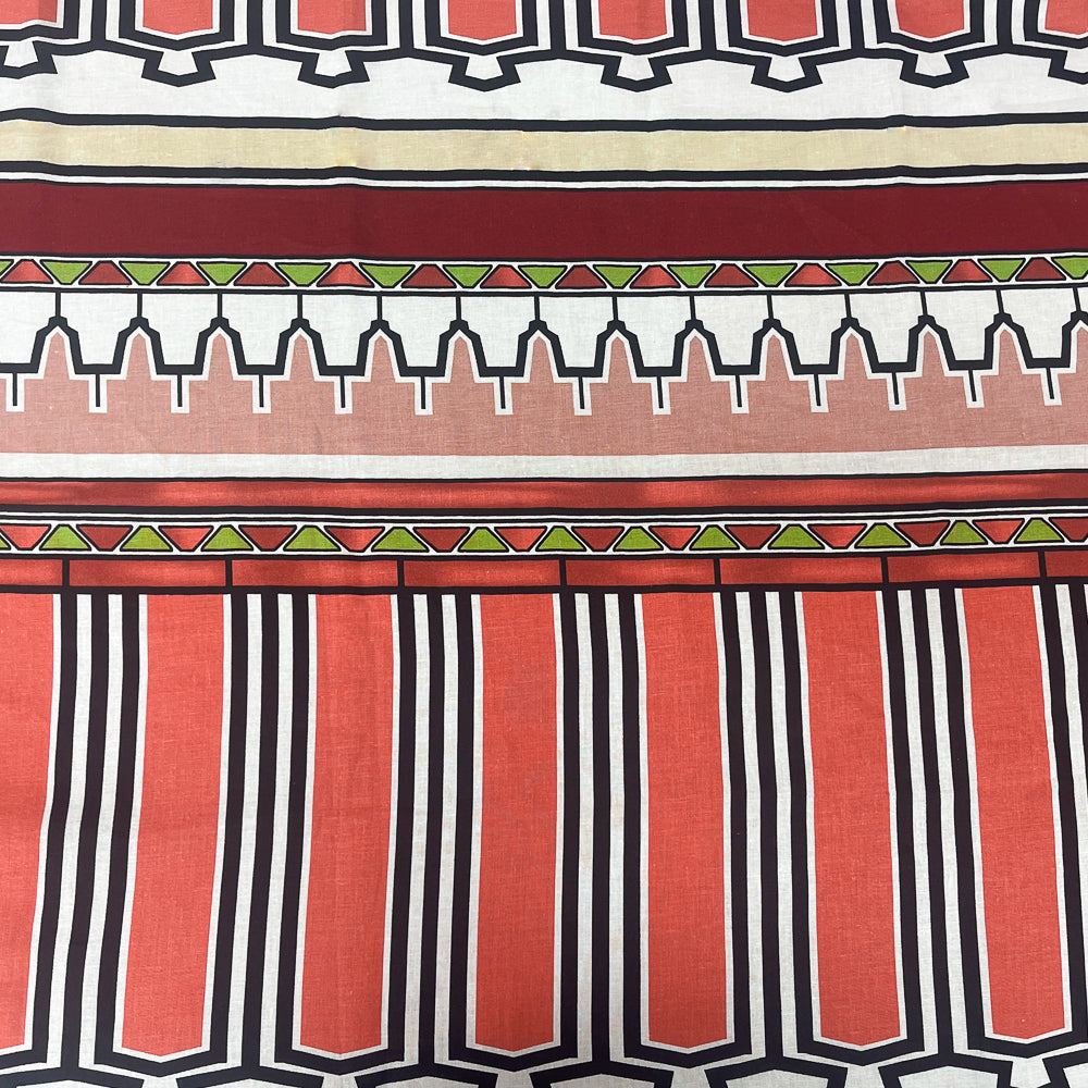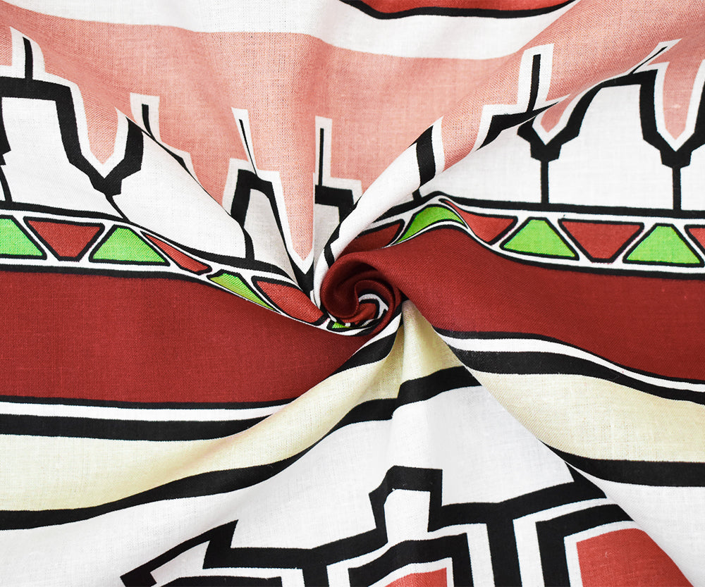 Red-Green-Multi Abstract Aztec Stripe Pattern Printed Linen Woven Fabric