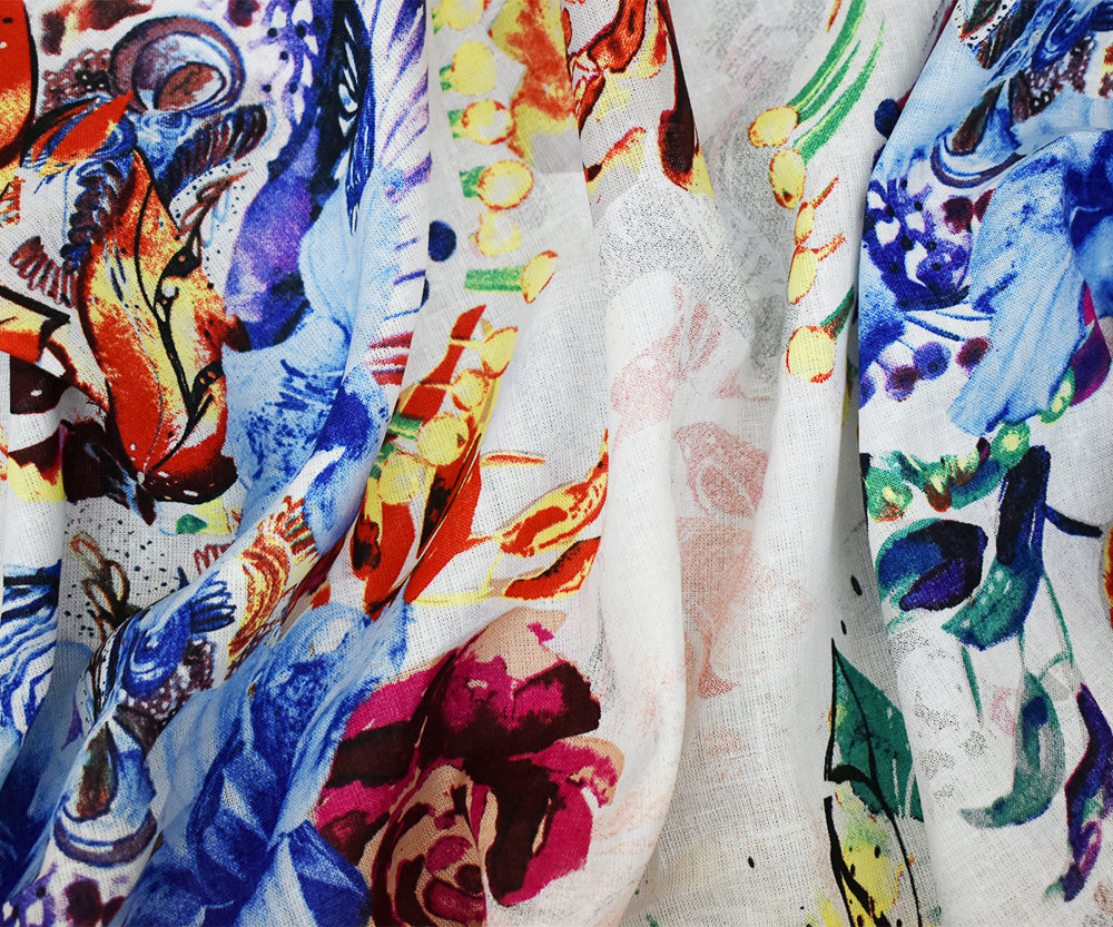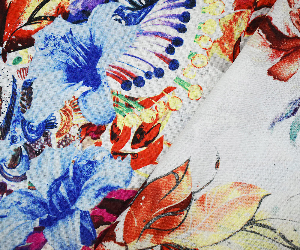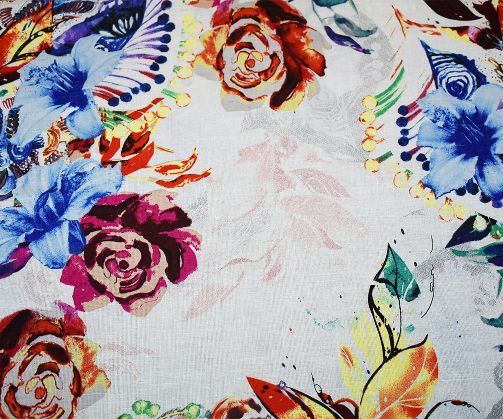 -100% linen plain woven fabric printed with a water color stylized artsy floral pattern. Line if needed.