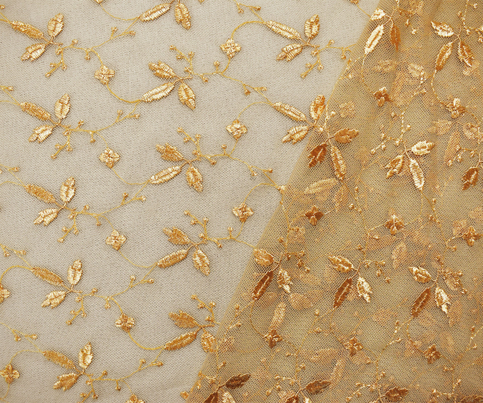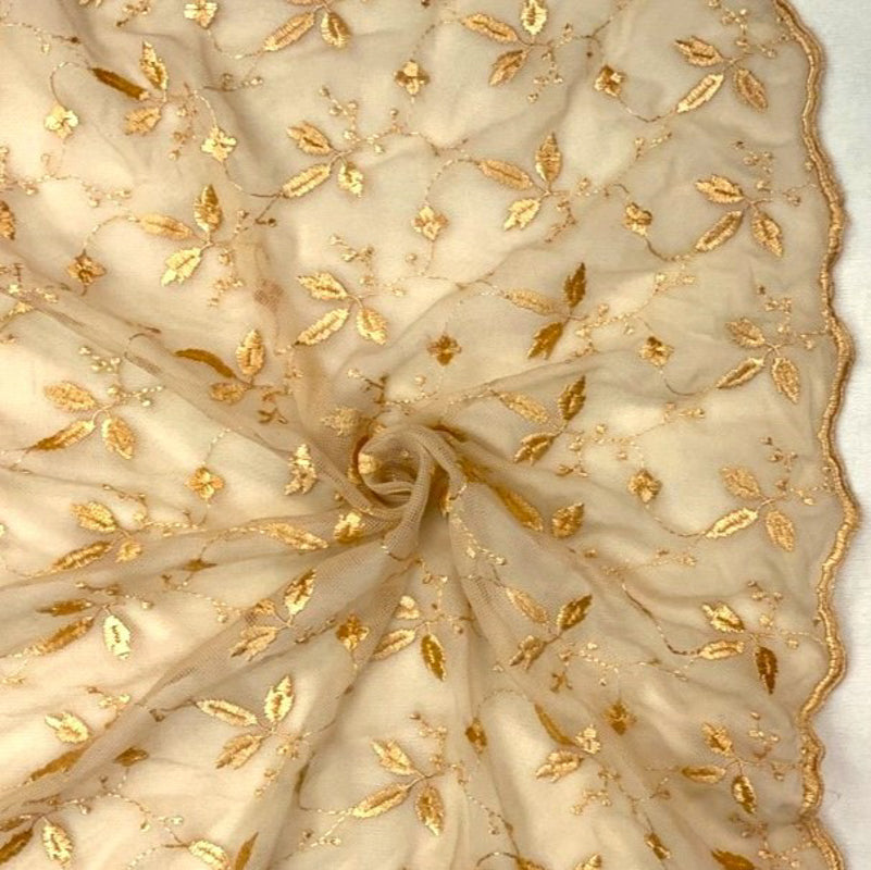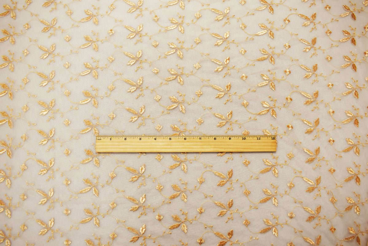 Tan Beige Nylon Floral Leaf Vine Embroidered Mesh Knit Fabric