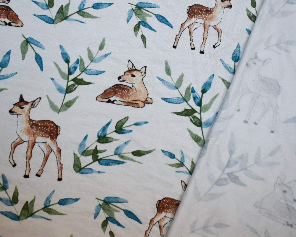 -Rayon and modal blend stretch spandex jersey knit fabric printed with a deer and leave motif