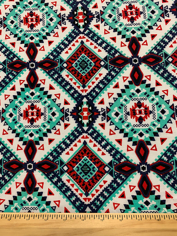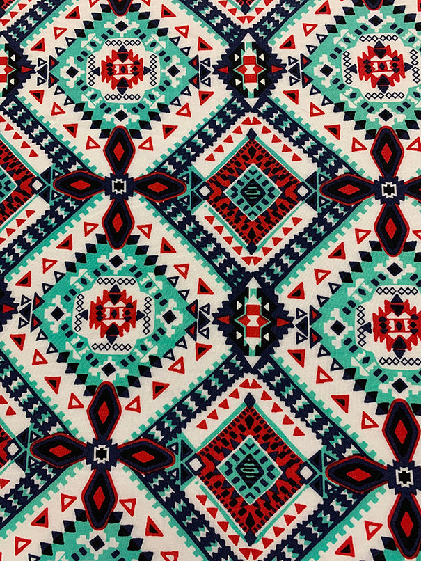 -Aqua, Red, Blue, & Black Multi Aztec Print on White Rayon Challis Fabric