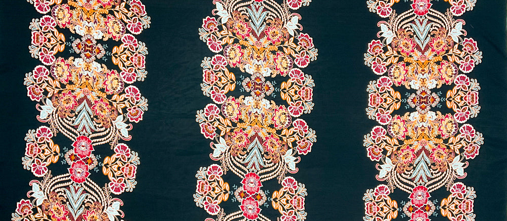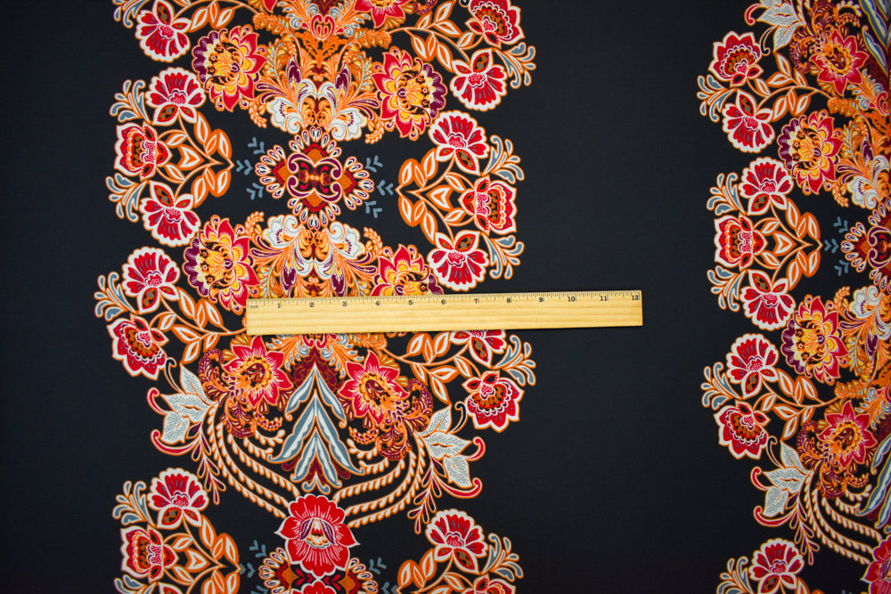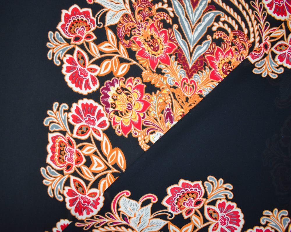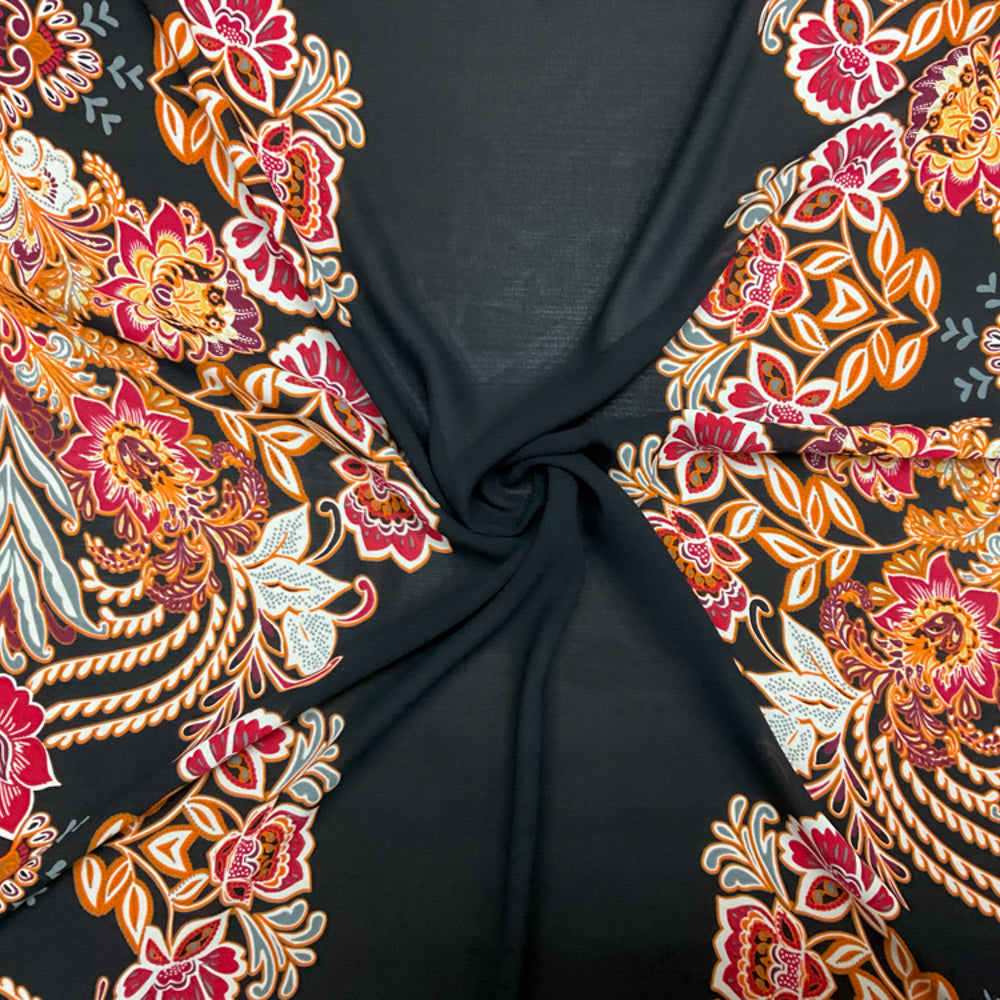 -Black-Orange-Multi Poly Floral Stripe Printed Chiffon Woven Fabric
