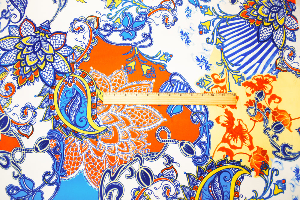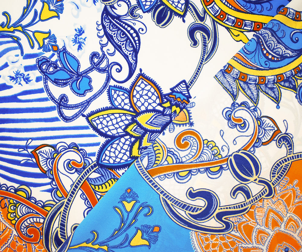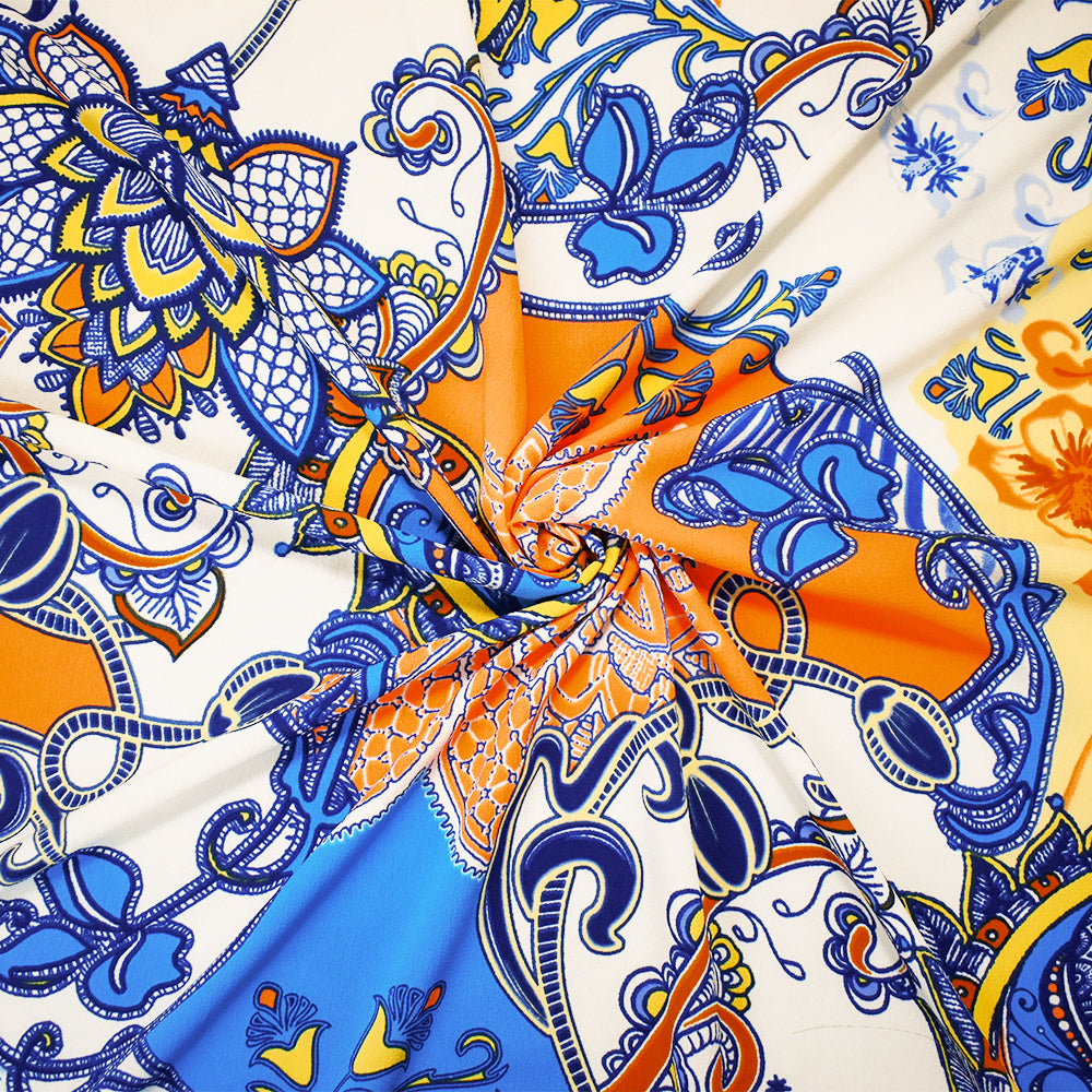-Blue-Ivory-Multi Poly Paisely Floral Print Pebble Crepe Woven Fabric