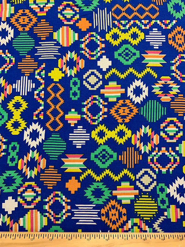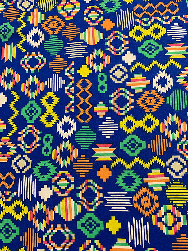 Blue Multi Color Aztex Print Rayon Challis Fabric