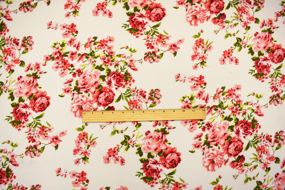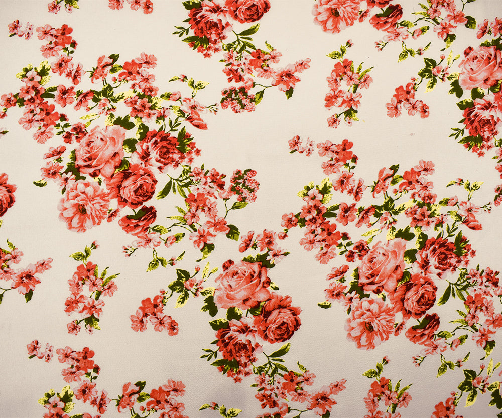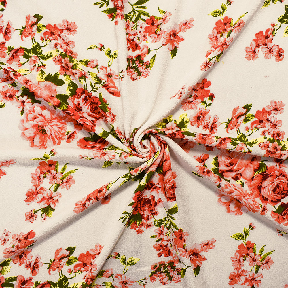 Coral-White-Multi Poly Floral Printed Pebble Crepe Woven Fabric
