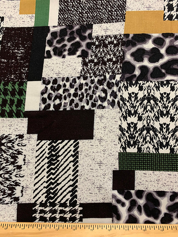 Green and Gold Patchwork Print Rayon Challis Fabric