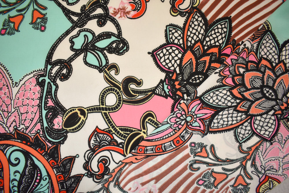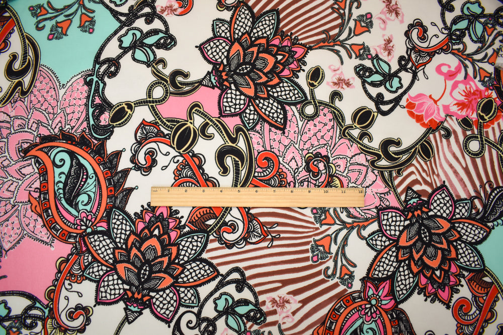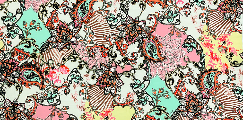 -Ivory-Turquoise-Multi Poly Paisely Floral Print Pebble Crepe Woven Fabric