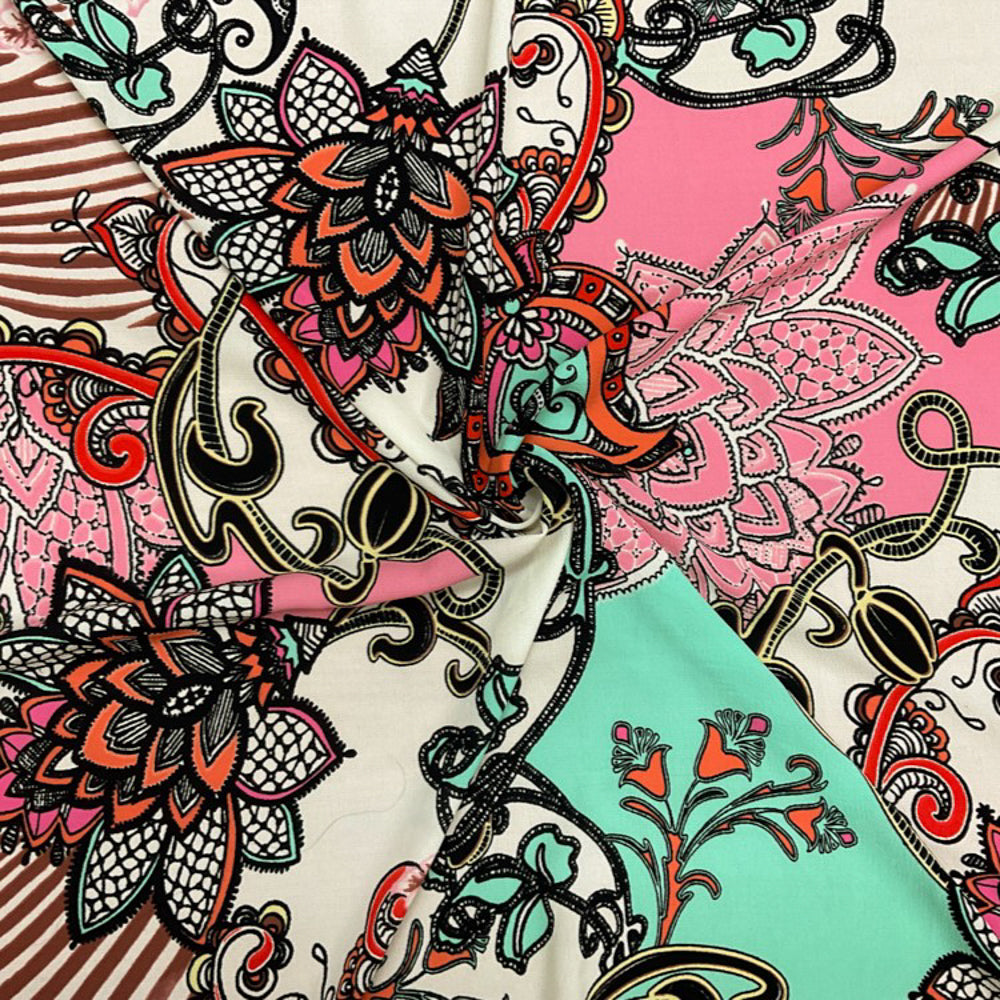 Ivory-Turquoise-Multi Poly Paisely Floral Print Pebble Crepe Woven Fabric