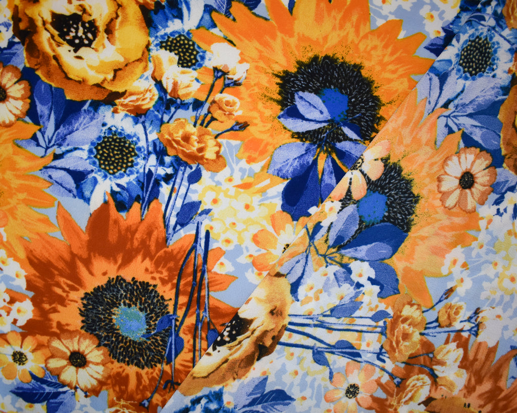 Orange-Blue-Multi Poly Floral Print Pebble Crepe Woven Fabric
