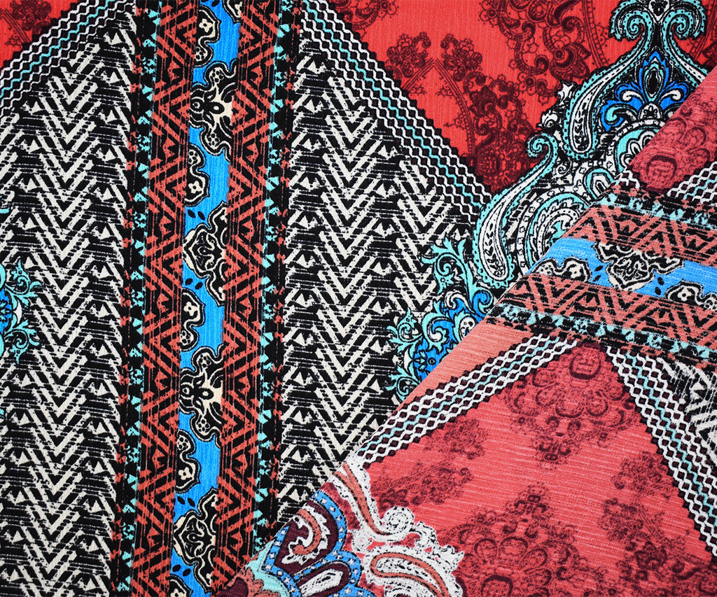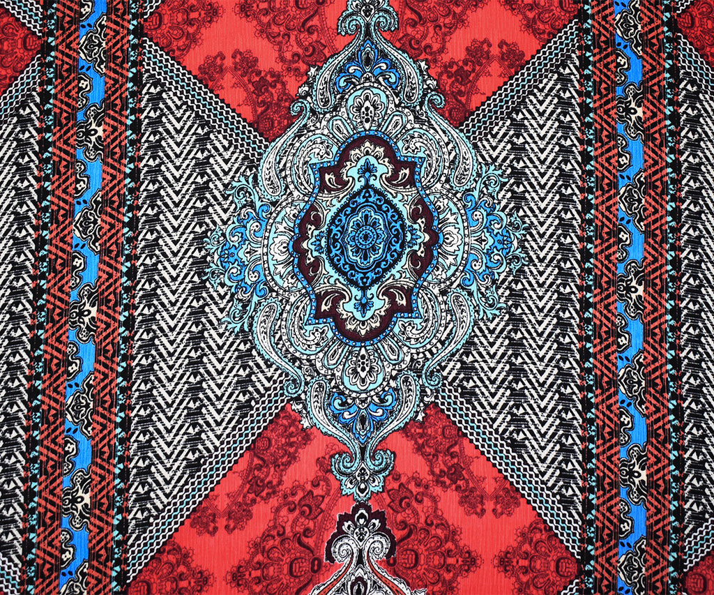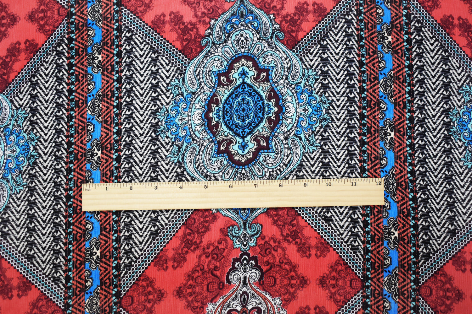 Red-Teal-Multi Poly Aztec Baroque Printed Textured Dobby Woven Fabric