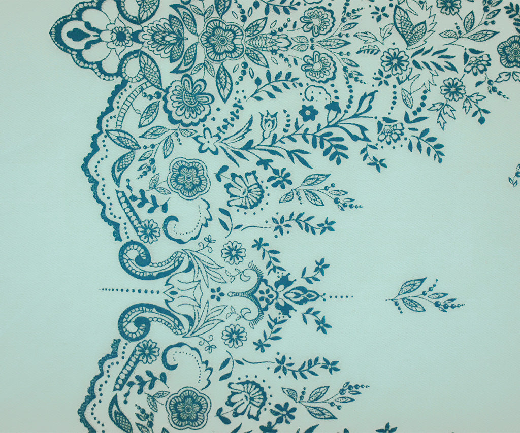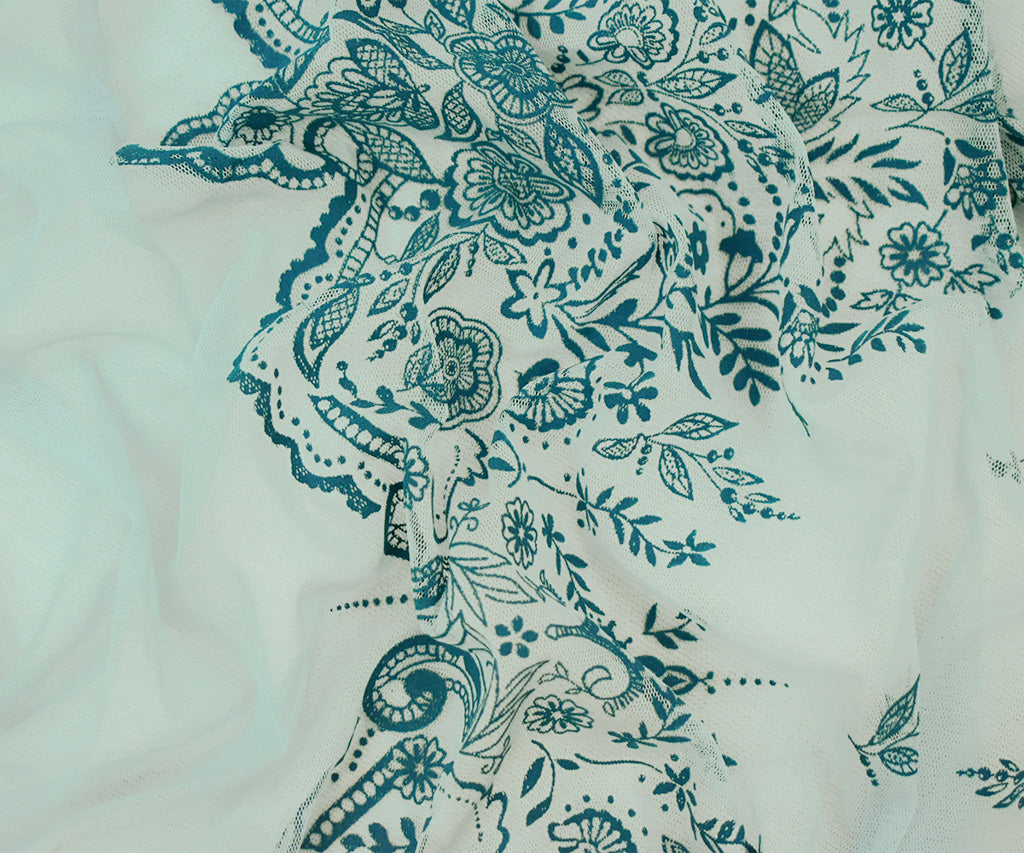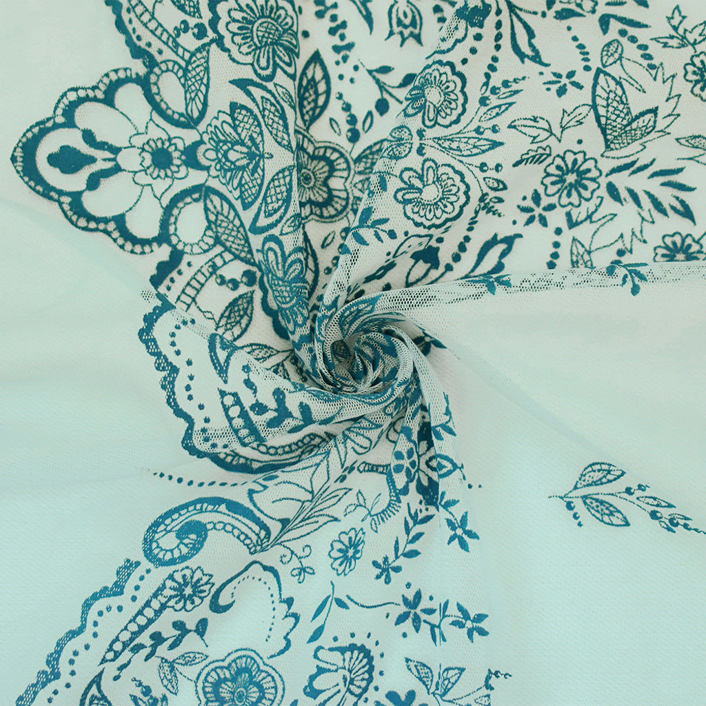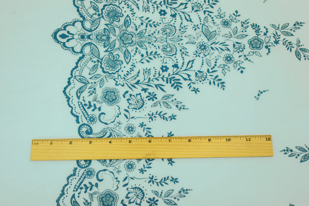 Light Blue-Teal Nylon Floral Border Scallop Printed Mesh Tulle Knit Fabric