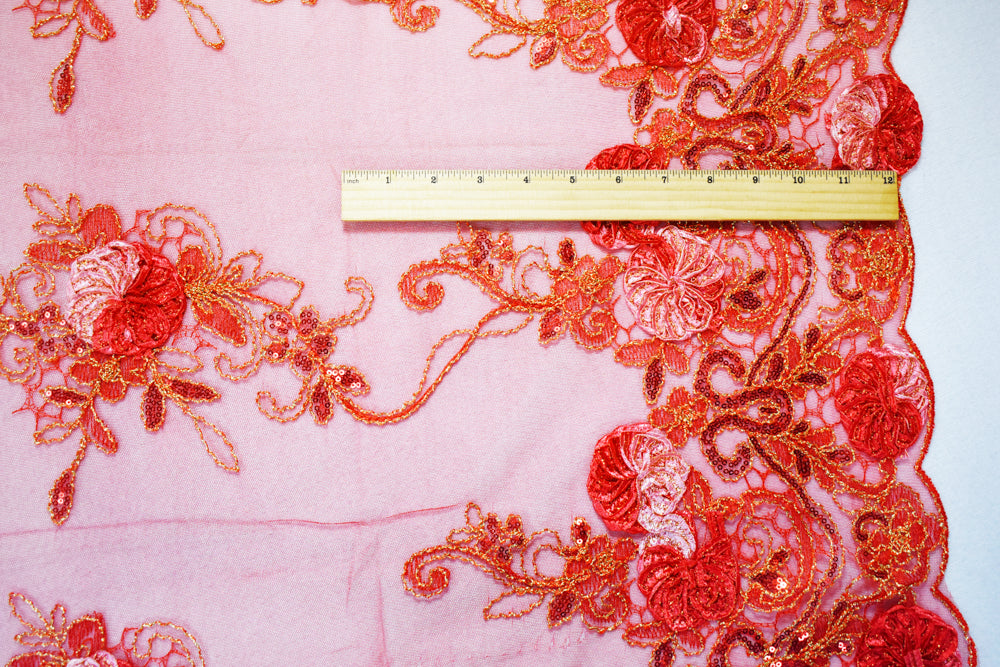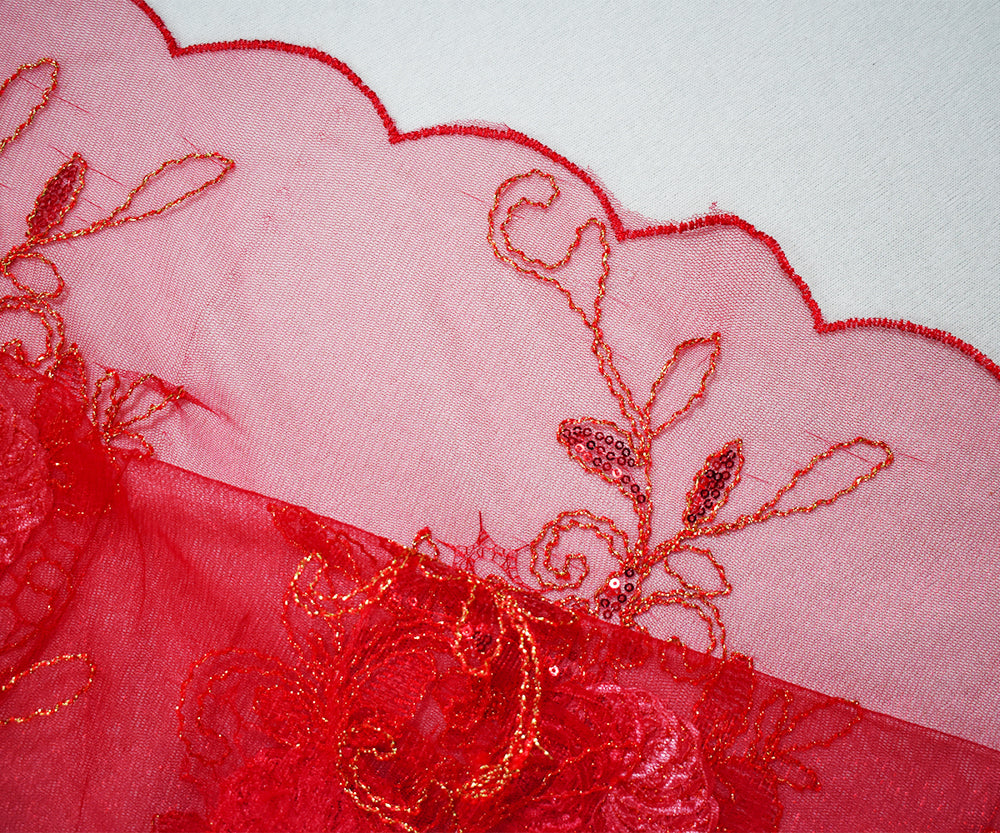 Red-Multi Nylon Embroidery Applique-Sequin Floral Scallop Tulle Fabric