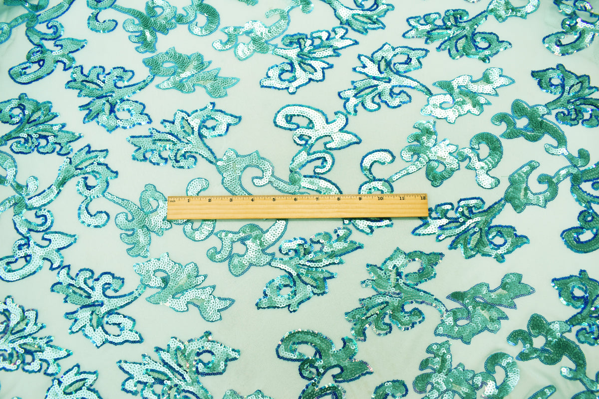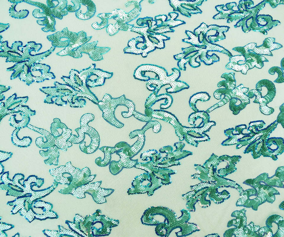 Teal-Blue Nylon Baroque Vine Sequined Stretch Spandex Tulle Mesh Fabric