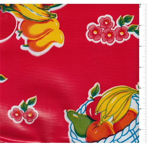 Red, Green, Blue, Yellow, Orange, & White Floral, Fruit, & Basket Print on Red Oilcloth Fabric Great for your breakfast or dinner table, patio, parties, BBQ's or picnic tables. Many use oilcloth for baby play areas, sewing/art projects, bags, totes, book covers, runners, placemats, gifts, or scrapbooks. Durable even when used with hot plates Easy to wipe clean with warm, soapy sponge Face is 100% PVC Back is 65% Polyester 35% Cotton Mesh 45" Wide Waterproof and protected with a clear finish Fade, stain, and soil resistant Imported from Mexico Usually $120.00/roll