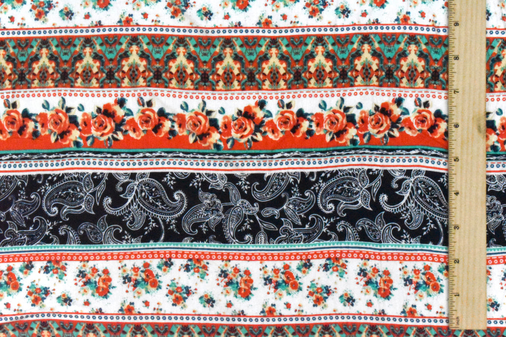 Ivory-Red-Multi Mix Pattern Stripe Printed Stretch Rayon Jersey Knit Fabric
