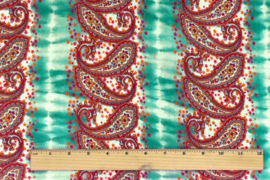 Teal-Red-Multi Striped Paisley Printed Rayon Stretch Jersey Knit Fabric