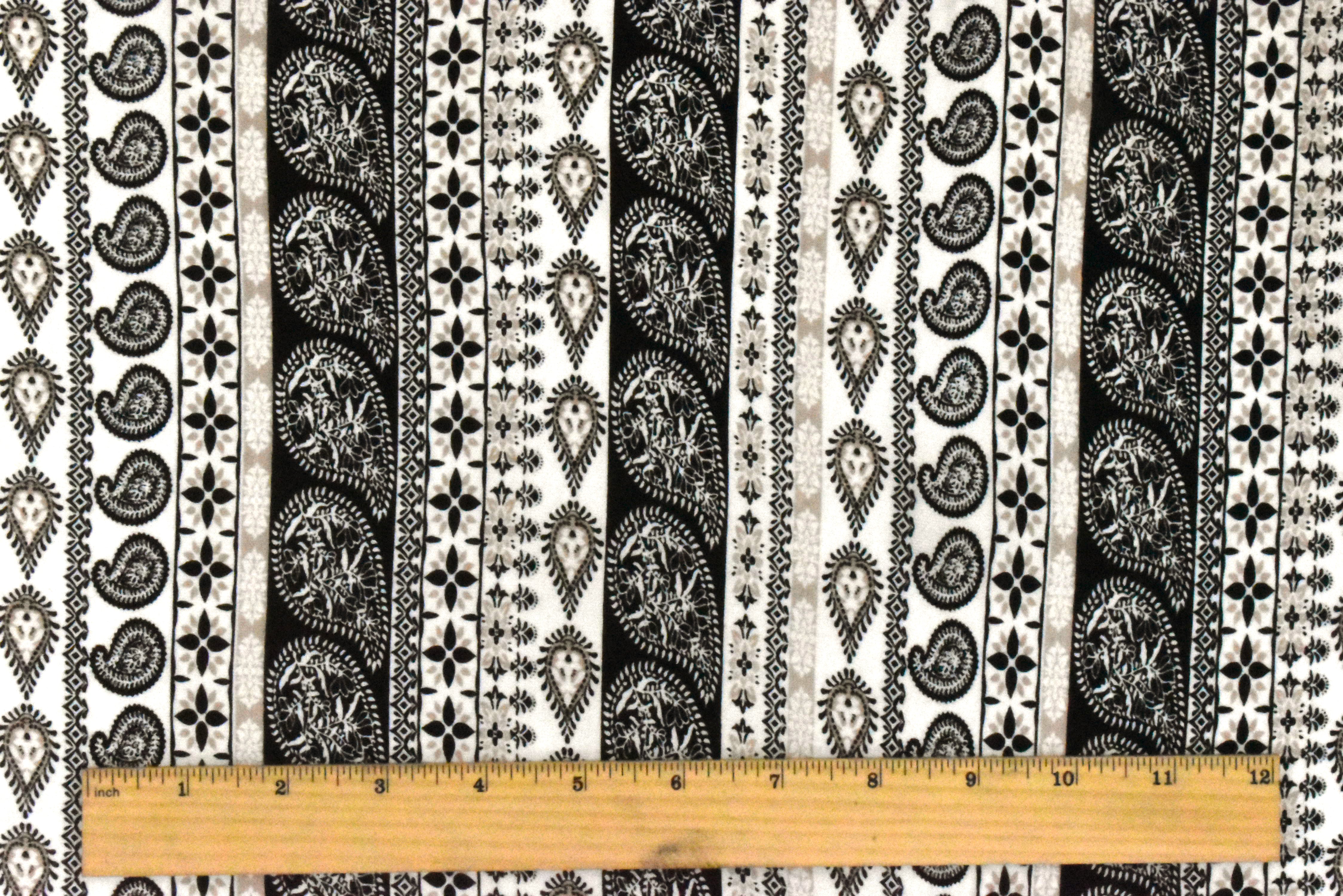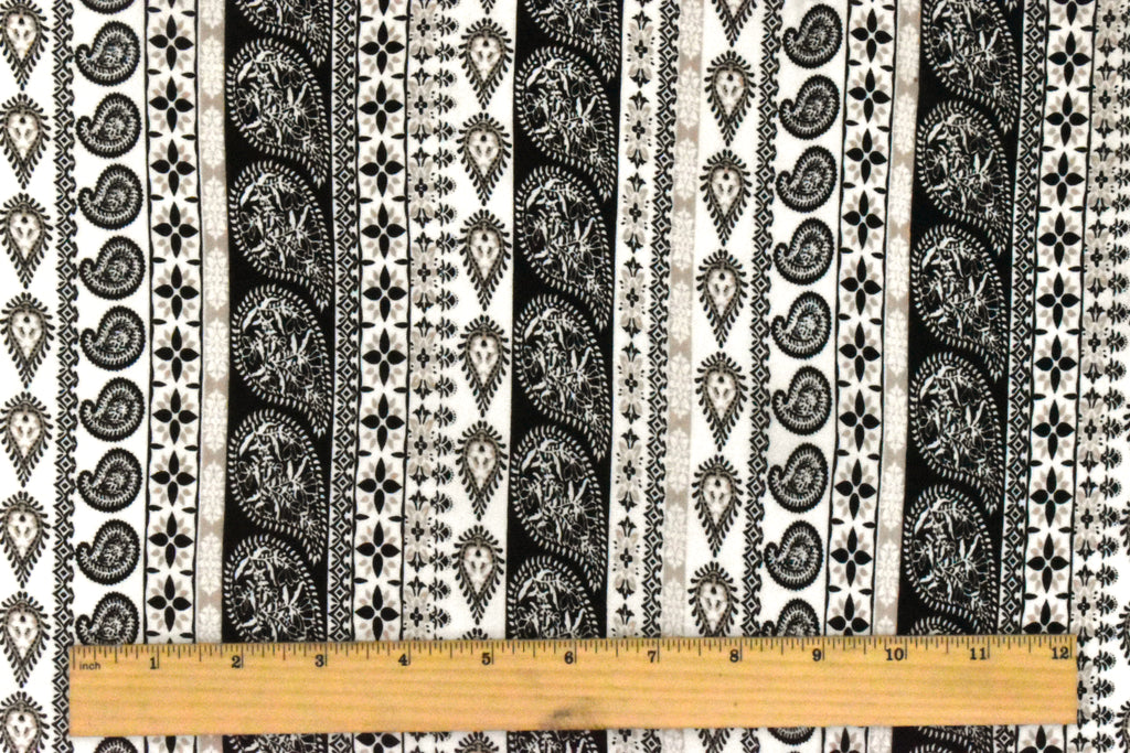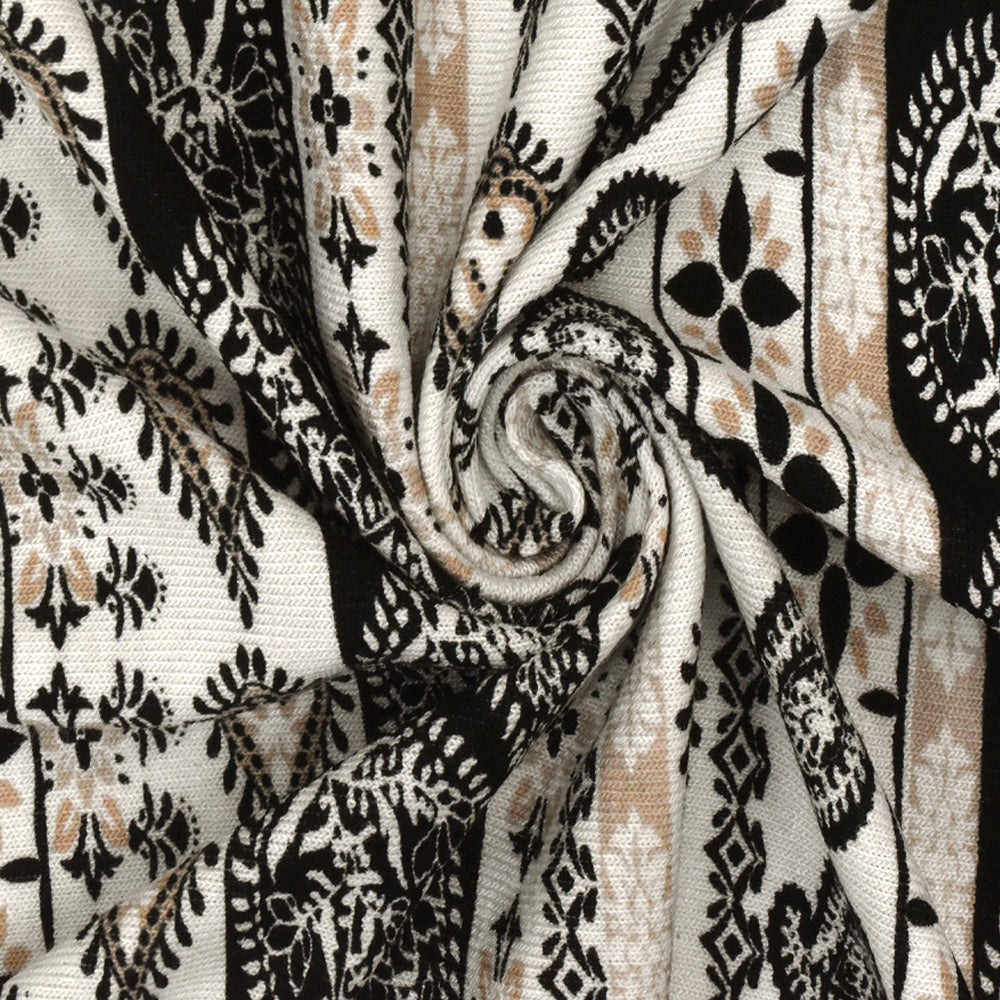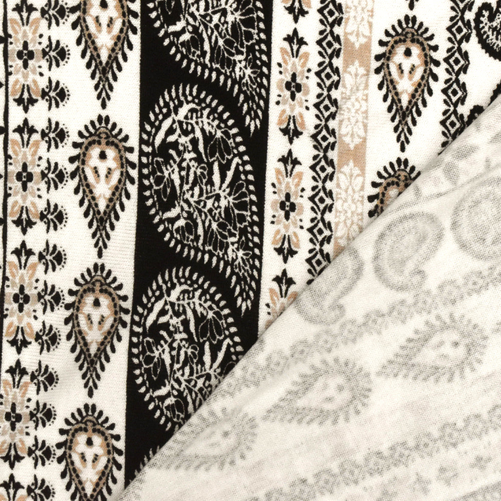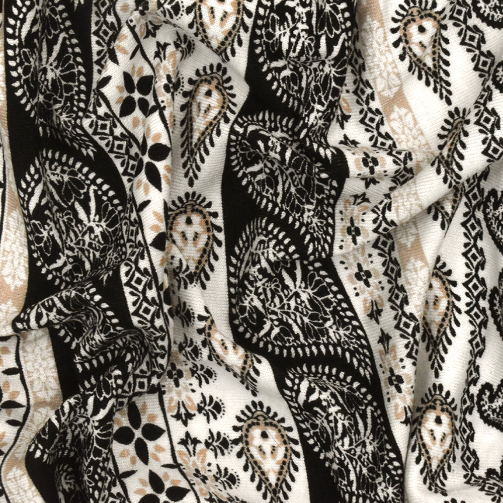White-Black-Beige Paisley Stripe Printed Rayon Stretch Jersey Knit Fabric